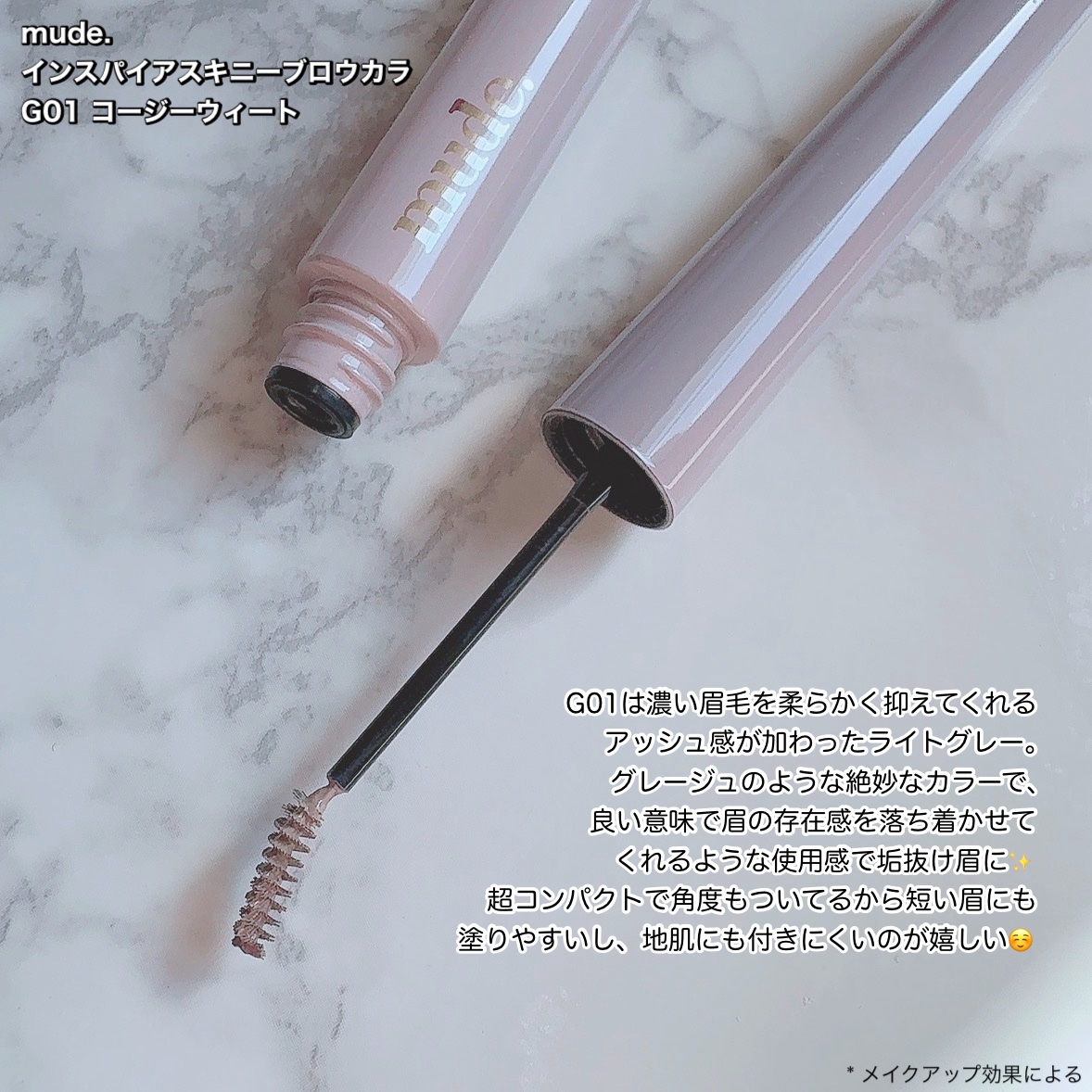 mude人気アイテムのマスカラ3種とブロウカラを紹介✨【インスパイアスキニーカーリングマスカラ】01ブラック05ミュートブラウン08モハーベピンク繊維落ち無しのファイバーFREEマスカラ。重ね塗りしてもダマになりにくいジェルテクスチャーで、小...