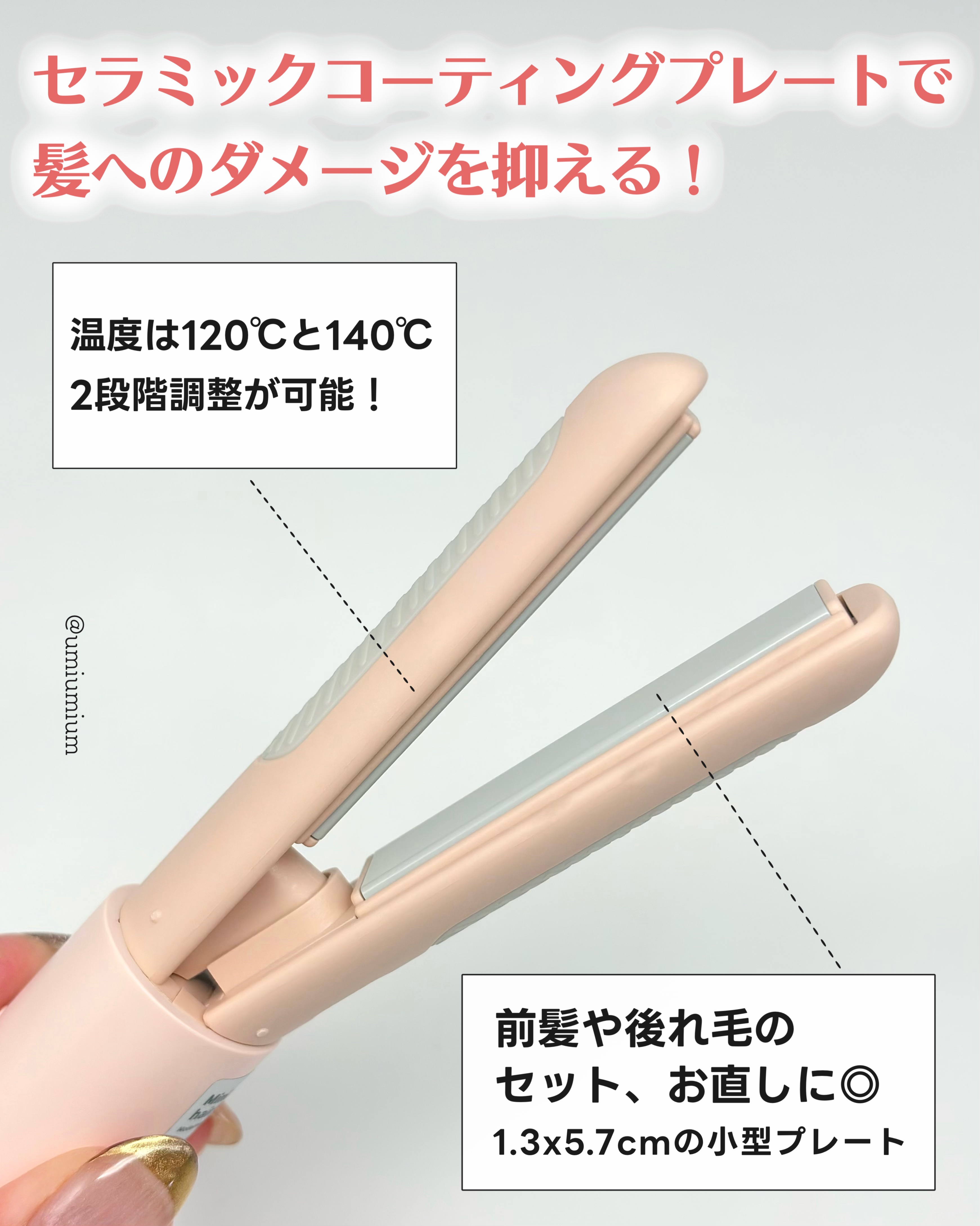 - いつだって前髪が大事。ポーチの中の”お守りアイロン” 手のひらサイズのミニアイロン。 前髪ひとつで、印象チェンジ -どこでも手軽にスタイリング- 付属のUSBケーブルをお手持ちのモバイルバッテリーなどにつないで、どこでも気軽に使えます。 3point ●軽量・ミニサイズ ●髪が傷みにくいセラミックコーティングプレート ●どこでも手軽にスタイリング ■USB給電式(Type C) USB Type-C端子から給電して動作します。 付属のUSBケーブルを、モバイルバッテリーやUSB電源アダプターにつなぐだけで、どこでも手軽に使えます。 ※充電式ではなく、使用中に給電が必要です。 ■軽い・小さい 重さ50g(たまご約1個分) 長さ12×直径2.5cm(手のひらサイズ) ■温度2段階調整 「120℃・140℃」の 2段階調整 可能。 ■セラミックコーティングプレート 髪の摩擦や引っかかりを軽減し、髪を傷みにくくします。 熱を均一に伝え、ムラのないスタイリングが可能です。 ●オートオフ機能付(約30分) ●収納時用キャップ付 【安全上のご注意】 (必ずお守りください) 専用キャップを外してから運転を開始してください。 ※キャップを外さず運転を開始するとキャップ内に熱がこもり高温になるため本体の破損ややけどのおそれがあります。 ※同封の取扱説明書を必ずご確認の上ご使用ください。