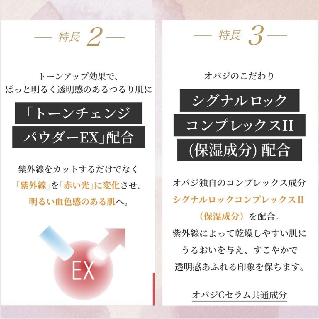 - <オバジC デイセラムUV> 水、BG、メトキシケイヒ酸エチルヘキシル、ジエチルアミ ノヒドロキシベンゾイル安息香酸ヘキシル、コハク酸ジエ チルヘキシル、ビスエチルヘキシルオキシフェノールメト キシフェニルトリアジン、酸化チタン、アスコルビルグル コシド、ベヘニルアルコール、グリセリルアスコルビン 酸、テトラヘキシルデカン酸アスコルビル、トコフェロー ル、異性化糖、ツボクサエキス、アーチチョーク葉エキ ス、カエサルピニアスピノサ果実エキス、カッパフィカス アルバレジエキス、酸化(Al/Ca/マンガン)、(ジフェ ニルジメチコン/ビニルジフェニルジメチコン/シルセス キオキサン)クロスポリマー、グレープフルーツ果実エキ ス、酸化亜鉛、マカデミアナッツ脂肪酸フィトステリル、グリセリン、カプリリルグリコール、ペンチレングリコー ル、ステアリン酸PEG-40、ジフェニルシロキシフェニル トリメチコン、ステアリン酸グリセリル、マイカ、ペンタ ステアリン酸ポリグリセリル-10、(アクリル酸ヒドロキ シエチル/アクリロイルジメチルタウリンNa)コポリマ ー、水酸化Na、ステアロイル乳酸Na、キサンタンガム、結 晶セルロース、トリ(カプリル酸/カプリン酸)グリセリ ル、カルボマー、シリカ、EDTA-2Na、DNA、アラビアゴ ム、アルミナ、カプリルヒドロキサム酸、ハイドロゲンジ メチコン、ステアリルアルコール、フェノキシエタノー ル、エタノール、香料