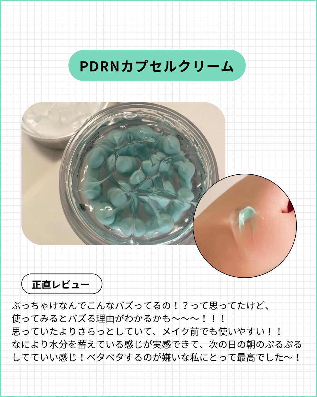 VTPDRNカプセルクリーム100新作クリームゲット〜❤️コレめっちゃ気持ちいい〜透明なジェルと緑色のクリーム透明なジェルはすっーと肌に入って保湿いい感じ〜緑のクリームはしっとり肌を覆ってくれる私は鼻とか顎はニキビできやすいから透明なジェルで...