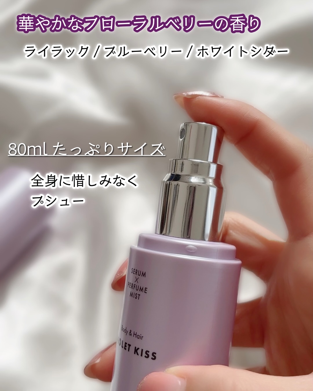 - 100%プレミアムウィーガンフレグランス 天然香料のオードトワレパフュームとセラムをミストに込めて── - VIOLET KISS - ◆NOTE:華やかなフローラルベリーの香り◆ ライラック・ブルーベリー・ホワイトシダーウッド ジューシーなブルーベリーとふんわり咲くライラックのハーモニー ホワイトシダーウッドでちょっぴりシックに、 キュンとときめくラベンダーカラーのフルーティーフレグランス ◆INGREDIENT:自然由来のレシピ、パープルフォーミュラ◆ ・お肌のバリアを守るナイアシンアミド(保湿) ・生き生きとした印象を与えるライラックエキス(保湿) ・フレッシュなブルーベリーエキス(保湿)は整肌ケアをサポート ・植物由来(保湿)のセラムでやさしい使い心地でスキンケア ◆PERFORMANCE:ほんのりと長続きするオードトワレ◆ 濃度5%+ 長時間持続:心地よいバランスでほんのりと漂う残り香! 爽やかなフローラルベリーの香りが、お肌や髪にふわっととけこむようになじんで、長時間心地の良い空間で満たされます