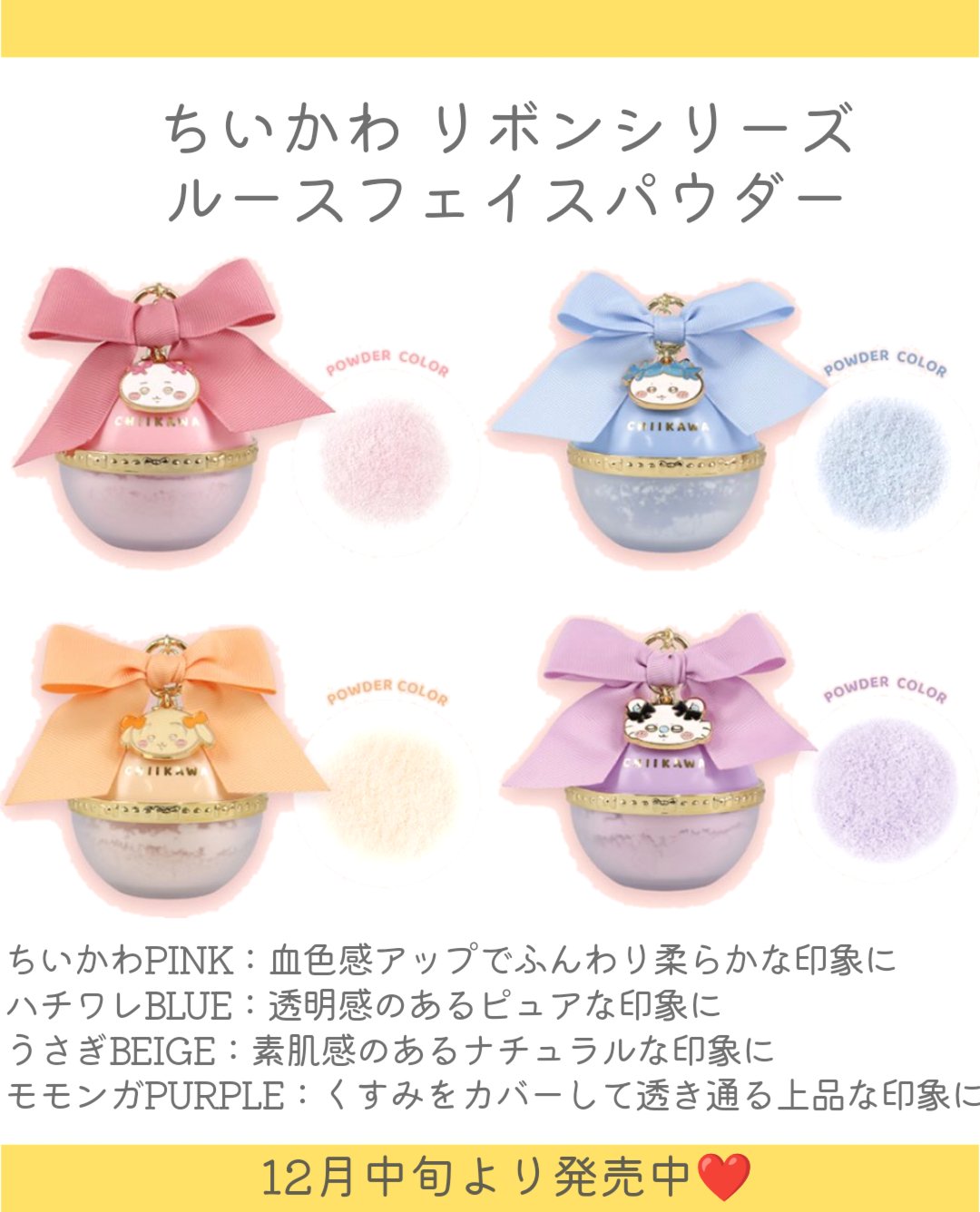 .【ちいかわリボンコスメシリーズ】粧美堂から、リボンをつけたちいかわたちがとってもキュートなコスメシリーズが新登場🎀ラインナップは、メイクブラシセット・アイシャドウパレット・ルースフェイスパウダー・ツイードティッシュポーチ・ダイカットフェイス...