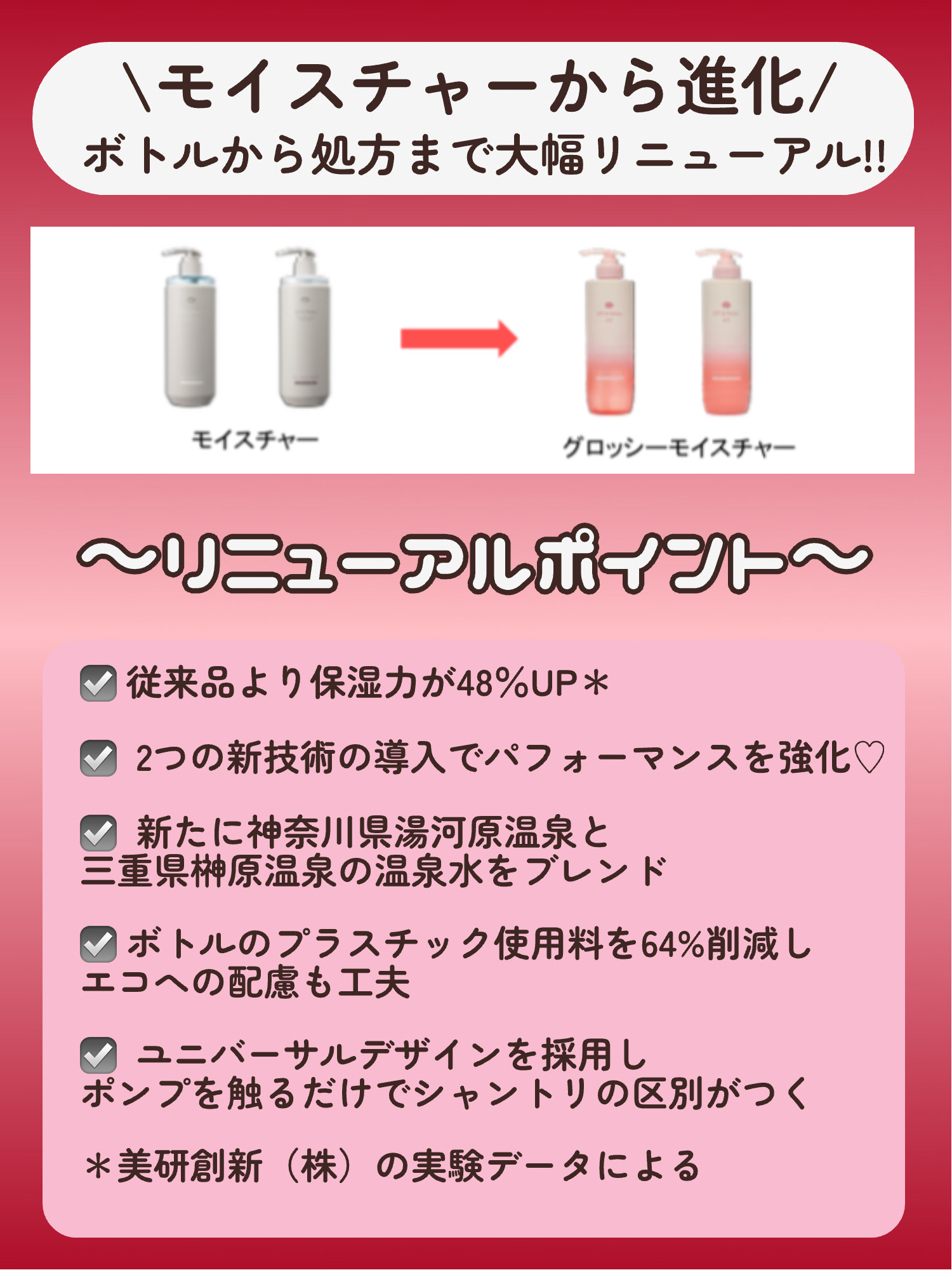- 2020年発売以来、初のリニューアル。ボトルから処方技術まで全面的にパワーアップ! 従来品モイスチャーがグロッシーモイスチャーへ。 ヒアルロン酸*1と厳選されたボタニカルエッセンスによる潤いチャージで、従来品より保湿力48%UP*2。 従来配合の温泉水(出雲・湯原・アルプス)に加え、神奈川県・湯河原温泉および三重県・榊原温泉の温泉水を新たにブレンドし、保湿力・洗浄力も向上。また頭皮の美肌菌に着目した処方を採用し、頭皮に必要な成分を守りながら、汚れや過剰な皮脂を洗い流し、健やかな頭皮環境を保つ。独自開発したSee-Fly処方*3を取り入れ、毛髪を軽やかにコーティングし、重すぎないしっとり髪へ。 ボトルデザインでは、プラスチック使用料を従来比64%削減し、エコへの配慮も工夫。そして触るだけでシャントリの区別ができるユニバーサルデザインの仕様に。 今回も調香師がオリジナル開発したアールグレイ&サンダルウッドの香りを配合。 紅茶とピーチのやさしい香りから始まるバスタイムは、ローズやジャスミンの華やかな香りが心をほぐし、ラストには深みのあるサンダルウッドとバニラの香りに包まれるご褒美の時間。 *1ヒアルロン酸Na *2(株)美研創新の実験データによる *3ラウロイルグルタミン酸ジ(フィトステリル/オクチルドデシル)、PPG-9ジグリセリル、PPG-34、PPG-52ブチル