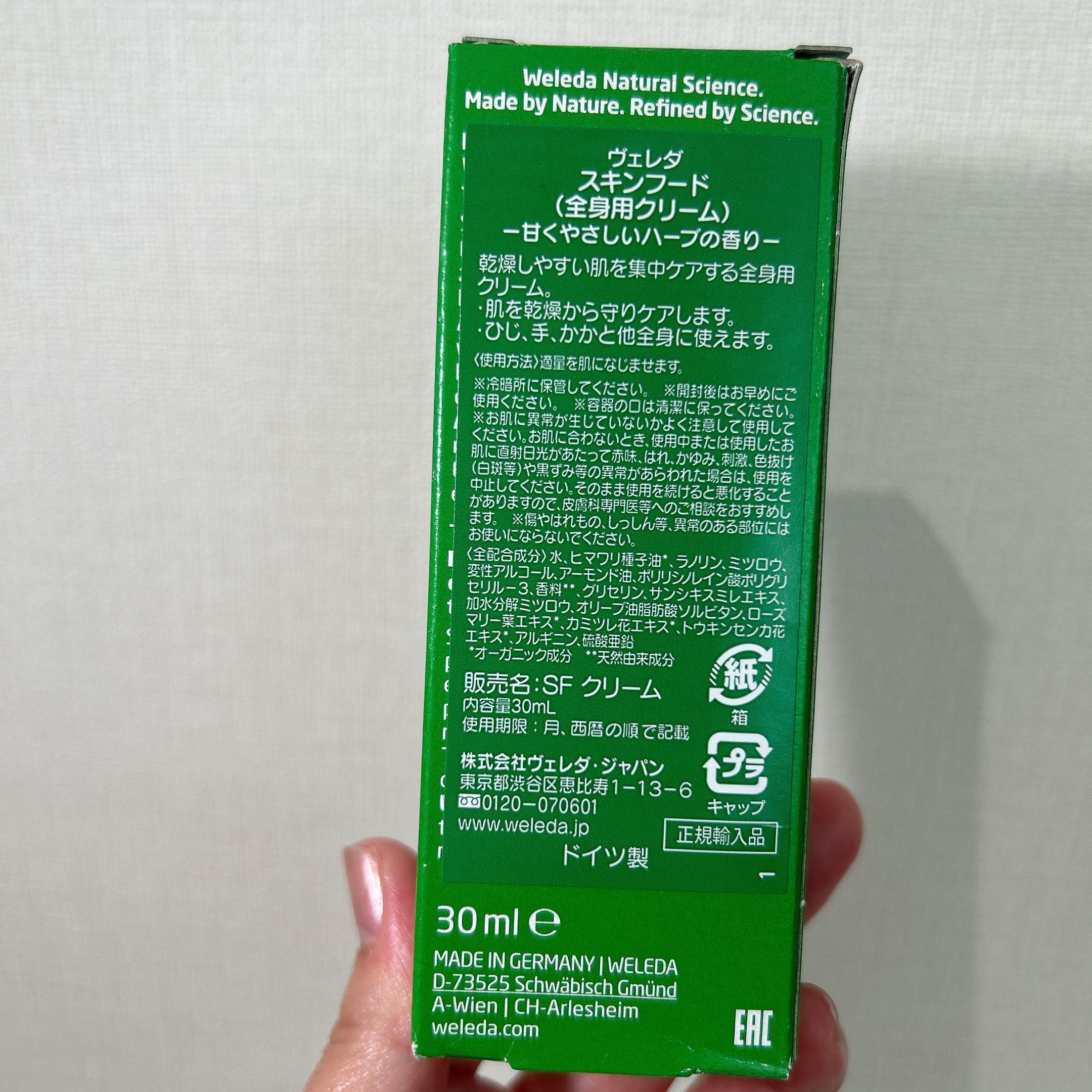 ヴェレダさまからいただきましたWELEDAスキンフード30mL1926年に発売されたロングセラーアイテム。肌荒れしやすい肌を深い潤いで包み込み、ふっくら柔らかく整える全身用集中保湿クリーム。チューブタイプで小さめのサイズ感なのでポーチに入れて...