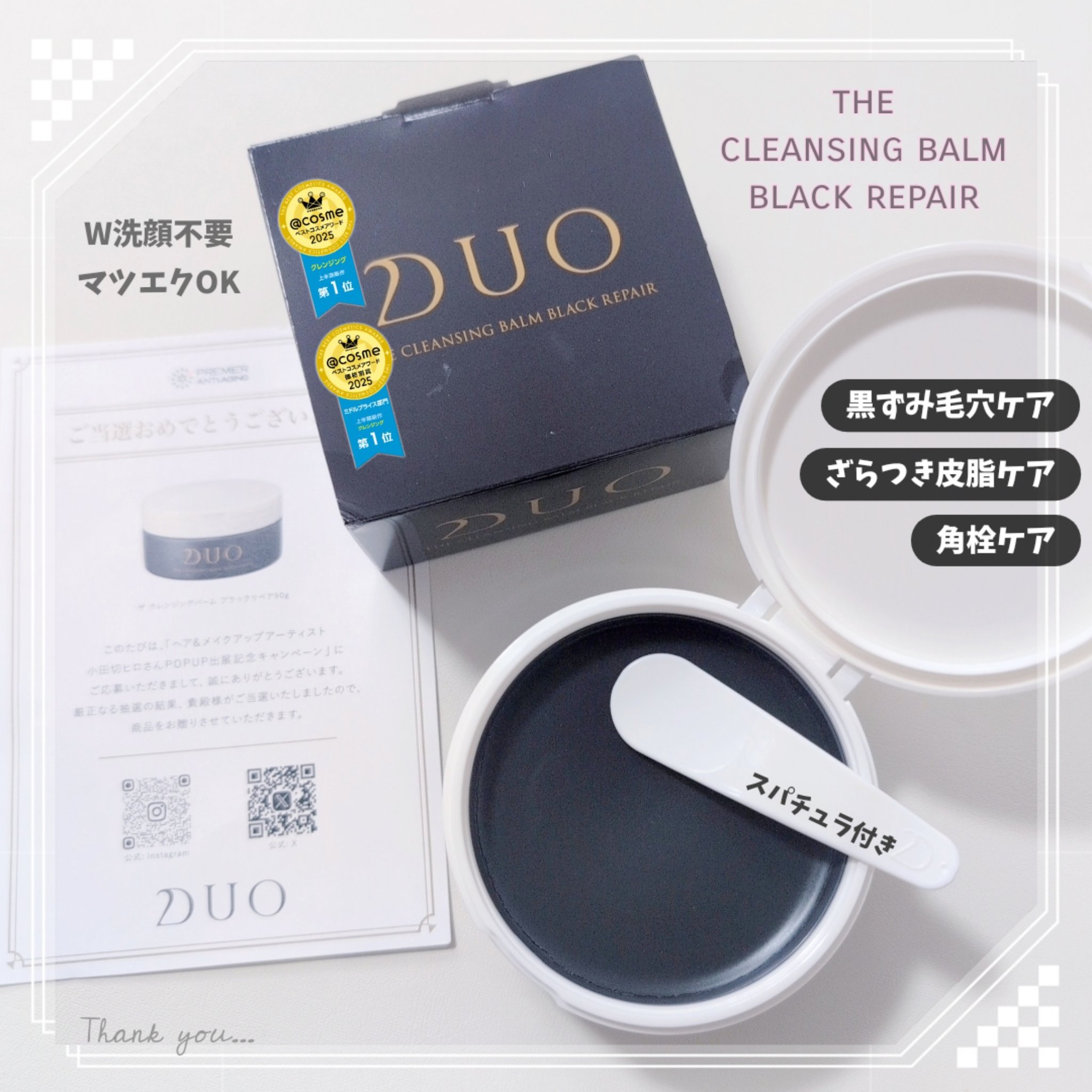 ❏デュオザクレンジングバームブラックリペア1月にリニューアルされたブラックリペア🖤頑固に居座る角栓や黒ずみ汚れを徹底的に落とすクレンジングバーム🫧ザラつきやテカリの元となる皮脂までケア♪W洗顔不要でまつエクOK(ꇐᴗꇐ)シトラスの香りでスッキ...
