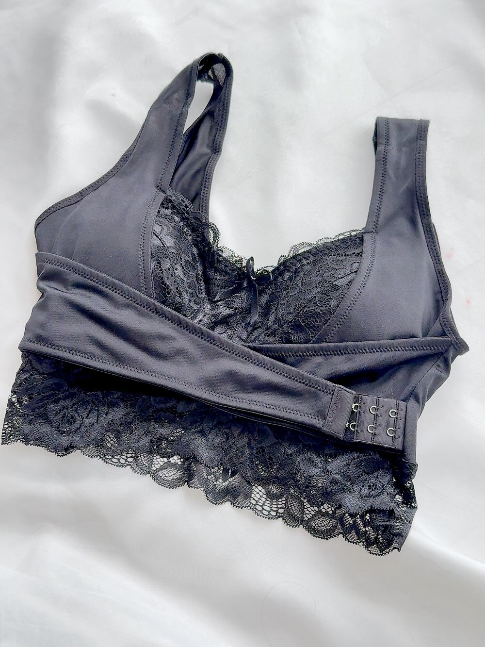 背中には着圧でバストが流れていかないようにガードが入っていたりパッドは下部分が厚くなっています。 デザインは肩周りだったりにもレースがありホック部分もレースになっていてカラーよくすみカラーがあったりしてナイトブラでもおしゃれなものになっています。 パッドは三角のタイプで、速乾性もあり洗濯のもすぐ終わります。