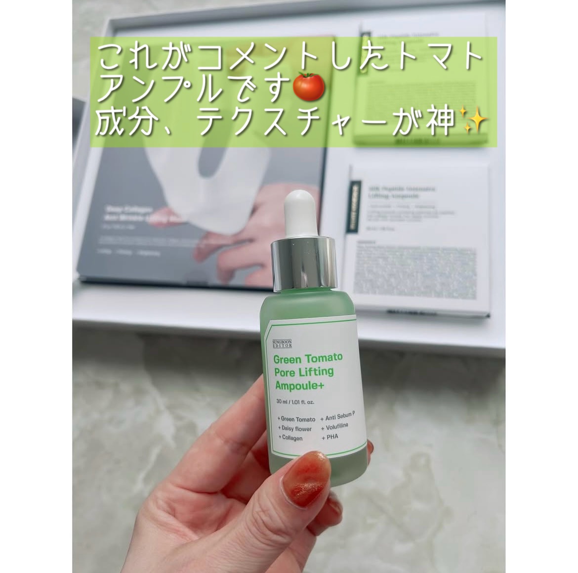 成分エディター(@sungbooneditor_jp)様のグリーントマトNMNポアリフティングアンプルをお試ししてみました💚ややとろみのあるテクスチャーで肌に馴染みやすい✨成分エディターの技術で厳選成分を凝縮毛穴にしっかりアプローチしてくれま...