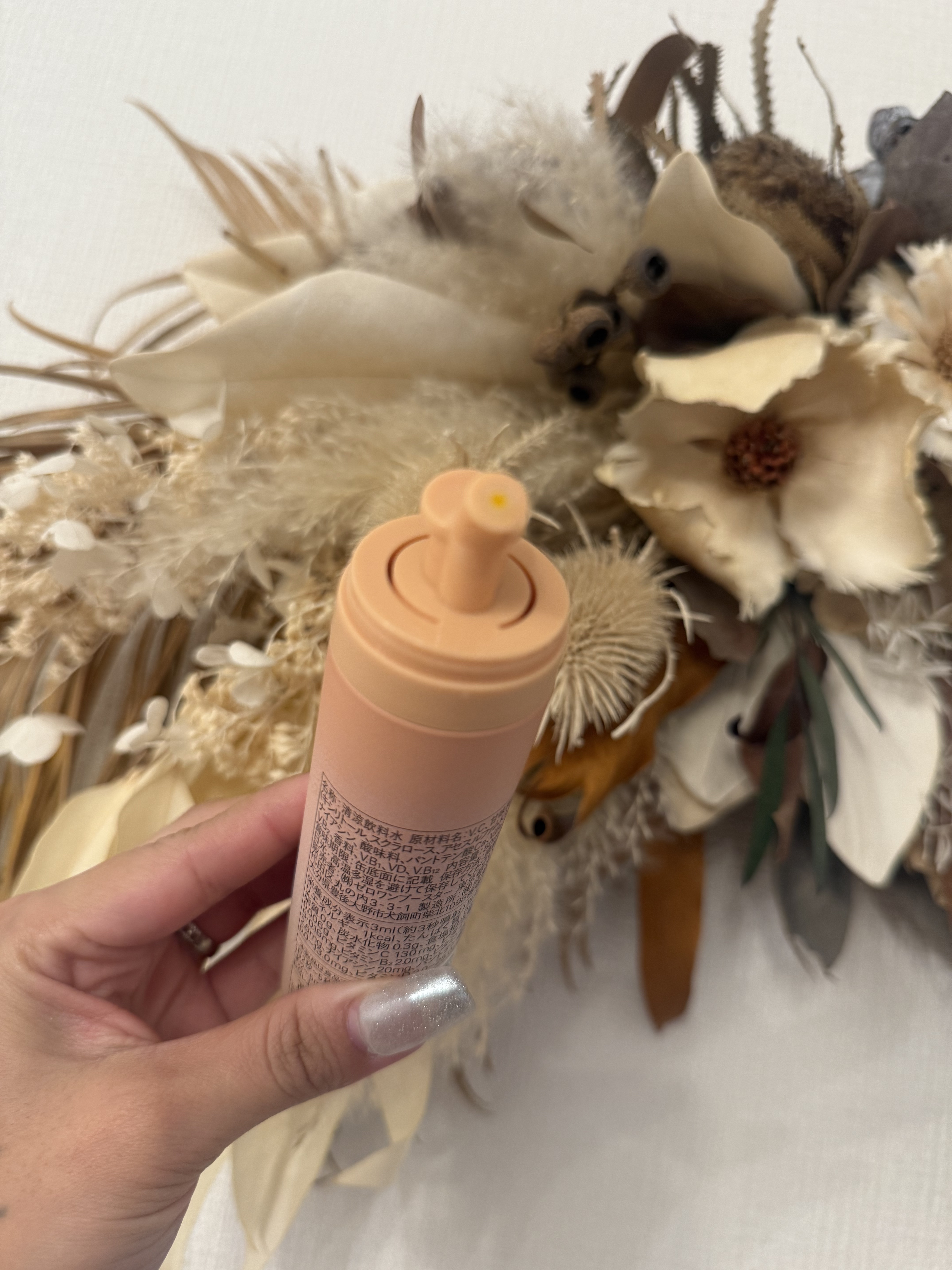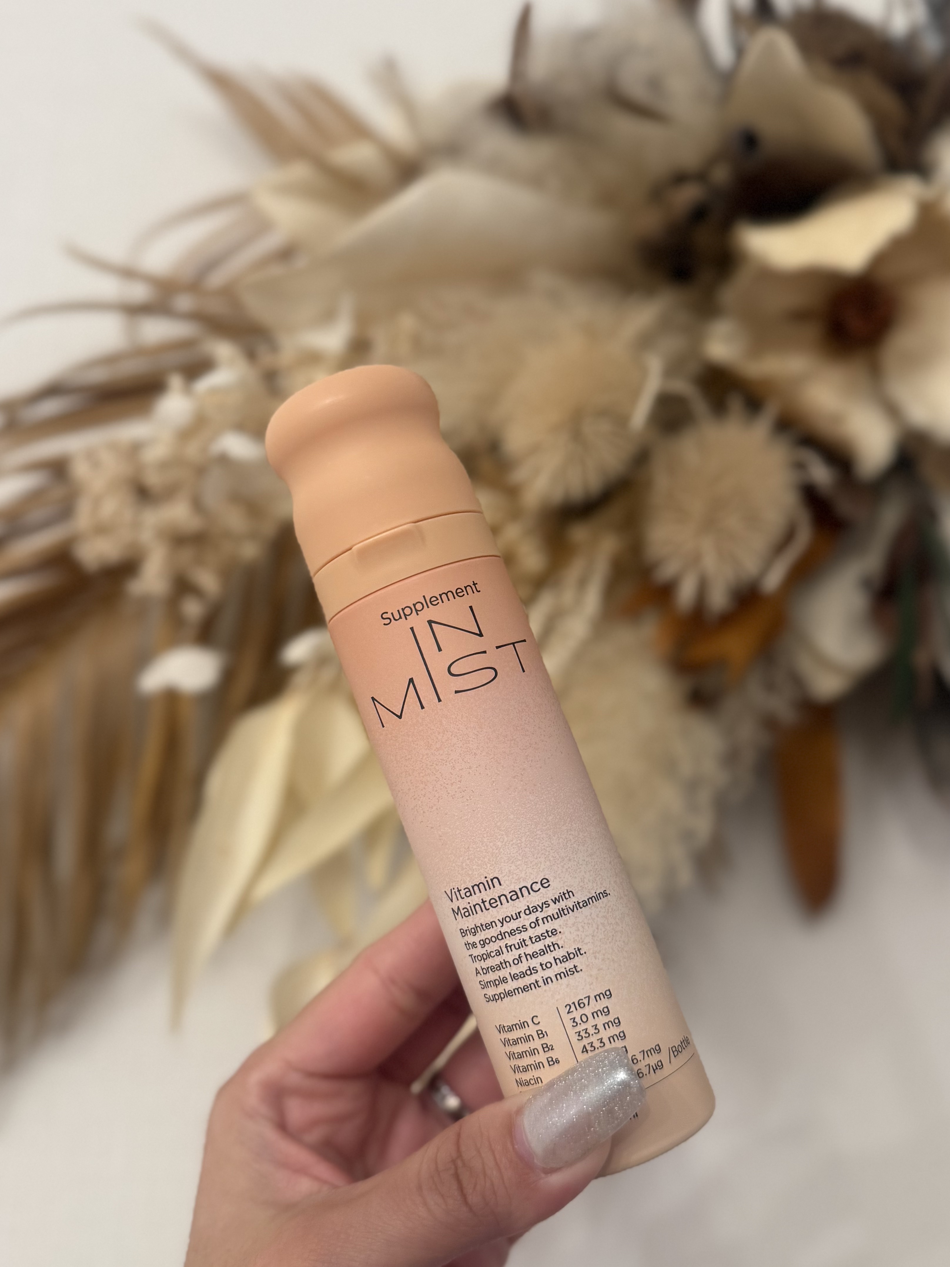 - ワンプッシュの美容ルーティン こまめなビタミン補給が、キレイの秘訣。 IN MISTは、ミストという独自の形でこの課題に対処しました。 水も不要、外出先でも美味しくワンプッシュ。液体ミストですぐに補給。独自開発の2重構造ボトルで常に高品質のまま届けます。 ◆Vitamin Maintenance とは ワンプッシュ1mlで7種のビタミンが美味しく補給できるミストサプリメント(トロピカルフルーツテイスト) 7種のビタミン ビタミンB1/ビタミンB2/ビタミンB6/ナイアシン/パントテン酸/ビタミンC/ビタミンD ◆使い方 STEP.01 容器のフタを開ける STEP.02 ノズルを口に向けてワンプッシュ 1本で約25日間を目安にお使いいただけます。(目安量1日2回プッシュの場合) ※使用回数や噴射時間によって個人差があります ◆Vitamin Maintenance の特徴 1.こまめなビタミン補給が、キレイの秘訣。 ビタミンは数時間で体外に排出されるため、本当に大切なのは“こまめな補給”。 IN MISTなら水も不要で、どこでも美味しくワンプッシュ。持ち運びもしやすいから、外出先でも。しかも液体ミストだからスムーズに届きます。 2.独自開発の2重構造ボトルで高品質なビタミンを ビタミンは光や空気に弱いデリケートな成分。そんなビタミンを守るため、IN MISTは徹底的にこだわりました。 独自開発のアルミ2重構造ボトル“フレッシュキープボトル”で、ビタミンを徹底ガード。 最後のワンプッシュまで、高品質なビタミンをお届けします。 3.誰もが続けやすいサプリ体験 サプリメントで最も大切なのは「継続すること」。 ワンプッシュの手軽さと、独自の創味技術で仕上げた美味しさで、誰でも自然に続けられるサプリ習慣で内側から美しさを。