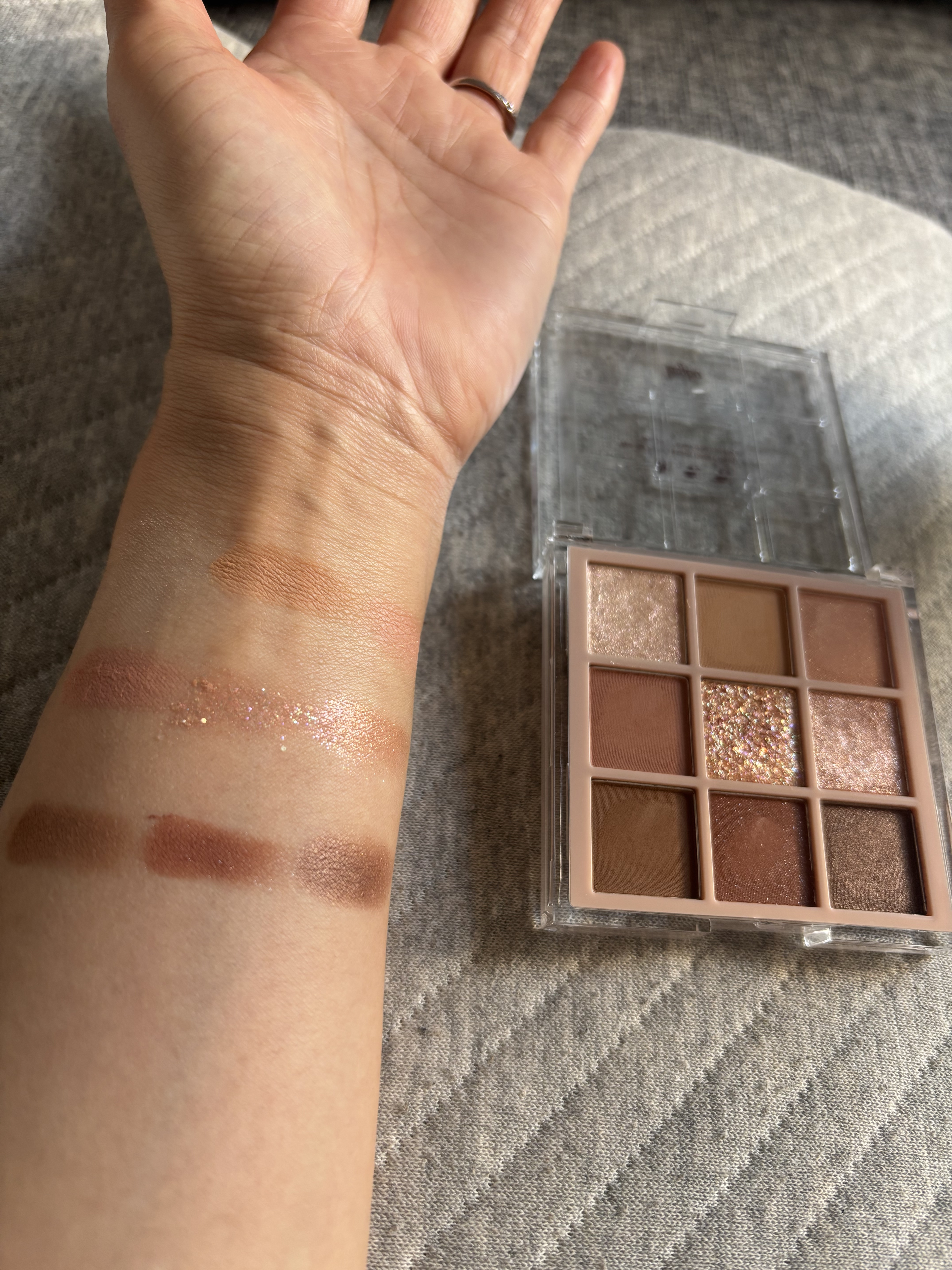 ピンクブラウン系の9色パレットです!赤みのある色味でかわいいです😌 マット、シマー、ラメ、グリッターとさまざまな質感のアイシャドウがセットされているので、使い方次第で色々なメイクが楽しめると思います🥰 発色はいいですが、ふわっとしていてボカしやすくとても使いやすかったです!粉飛びもなく、一日中ヨレずによかったです👏