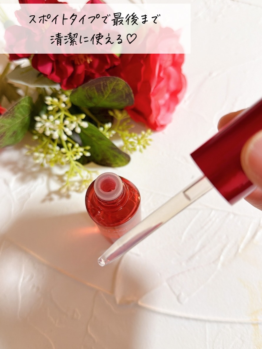 スポイトから出した瞬間は糸を引くほど とろ ~りした一滴だけど、スーッとお肌に馴染む😳 キャップを回すと 一回分の使用量が自動で吸い上がる容器になってて、 めちゃくちゃ便利だったー!! カサカサとしたお肌をなめらかに包んでくれ、 まるでうるおいの膜で守られるような感覚✨