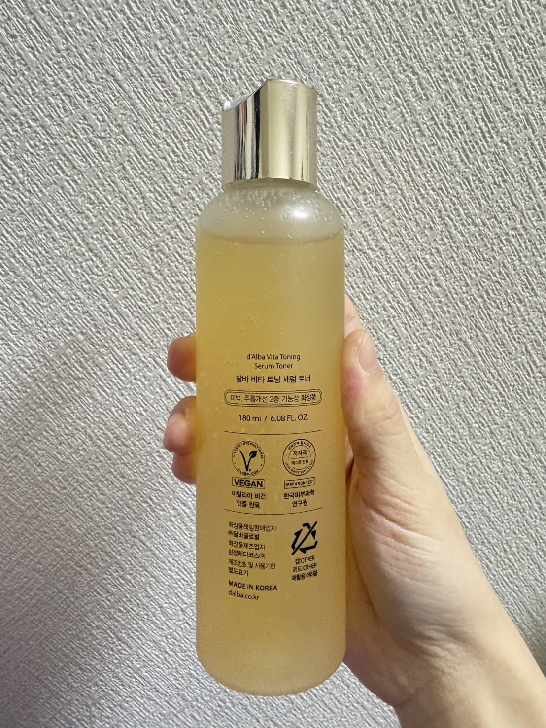 - 吸収の早いセラムウォーターテクスチャーでしっとり爽やかヴィーガンセラムトナー みずみずしさ弾ける水分感で保湿はしっかり、 仕上がりはさっぱり。 ヴィーガン認証完了で安心して使用して頂けます。 イタリアヴィーガン認証V-LABEL取得しました。 皮膚低刺激テスト済み* *全ての方に皮膚刺激が発生しないということではありません。 【ご使用方法】 1. デイリーケアとしての使用法 適量を手に取り肌にまんべんなく塗ります。 2.ふき取りケアとしての使用法 コットンに適量を含ませ肌のキメに合わせ撫でるように優しく吸収させます。 【使用上の注意】 本製品には小麦由来成分が含まれています、使用中に異常があった場合は使用を控え下さい。 お肌に異常が生じていないかよく注意して使用してください。 化粧品がお肌に合わないとき即ち次のような場合には、使用を中止してください。 そのまま化粧品類の使用を続けますと、症状を悪化させることがありますので、皮膚科専門医等にご相談されることをおすすめします。 (1)使用中、赤味、はれ、かゆみ、刺激、色抜け(白斑等)や黒ずみ等の異常があらわれた場合 (2)使用したお肌に、直接日光があたって上記のような異常があらわれた場合 傷やはれもの、しっしん等、異常のある部位にはお使いにならないでください。