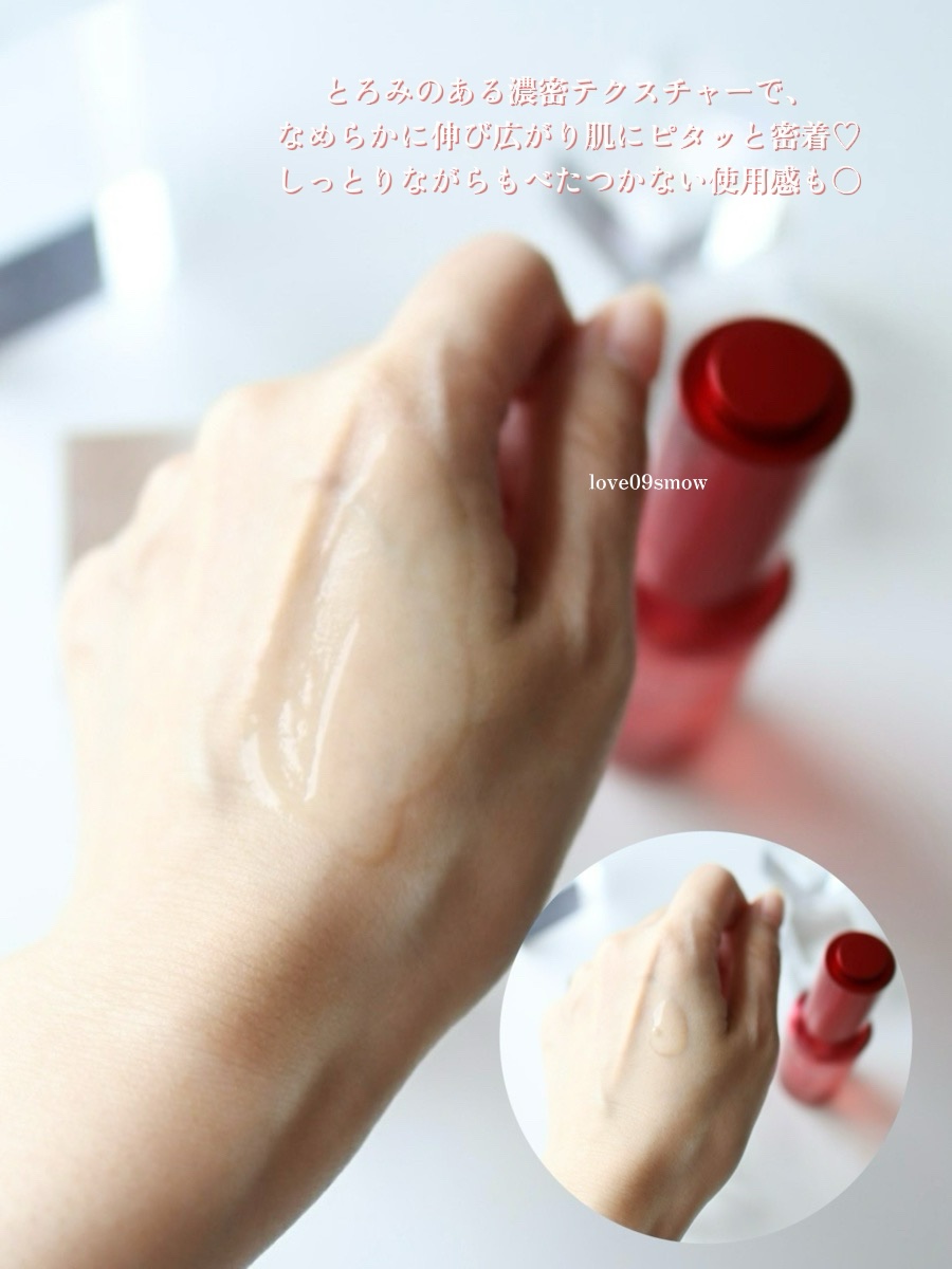 | 糸を引くくらい濃密で とろみのあるテクスチャー。 肌に膜がはったような密着感があり、 その後肌にすーっとなじんでベタつかない。 | 詳細を見る | |