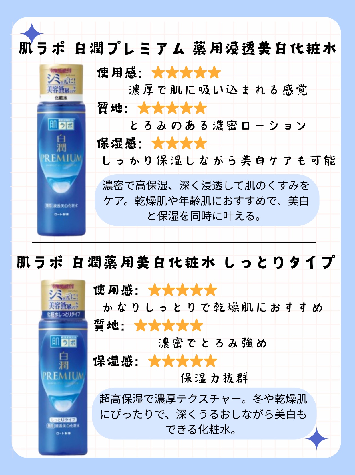 白潤プレミアムは敏感肌の私も使いやすく美白ケアのできる化粧水なのでお気に入り❤️🔥 極潤プレミアムヒアルロン液が1番しっとりしていて保湿力が高くて好きでした!乾燥がひどい時に使いたいのはこれ一択! 全種類アルコールフリーなのが個人的に嬉しいです♡香料が苦手で無香料なのも使いやすくて好きです!