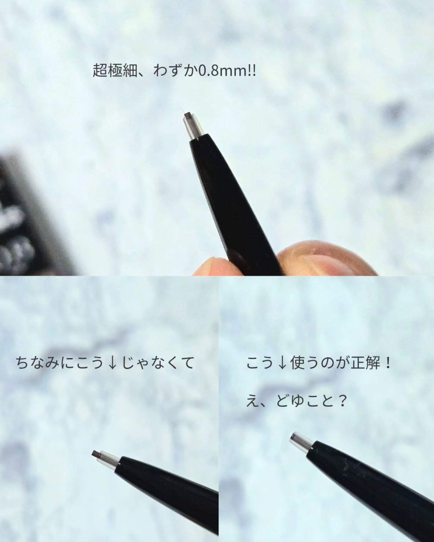 - まるでシャーペンで描くようなリアルな毛流れ眉が完成。 折れにくい 0.8mmの超極細芯。 #眉シャーペン ●直径0.8mmの極細芯により、眉尻の細かい部分や隙間埋めなど眉の一本一本まで繊細リアルに描ける ●上下に動く保護パイプつきだから、超極細芯でも折れにくい! ●汗・水、皮脂・こすれに強く、描いた眉をきれいにキープ