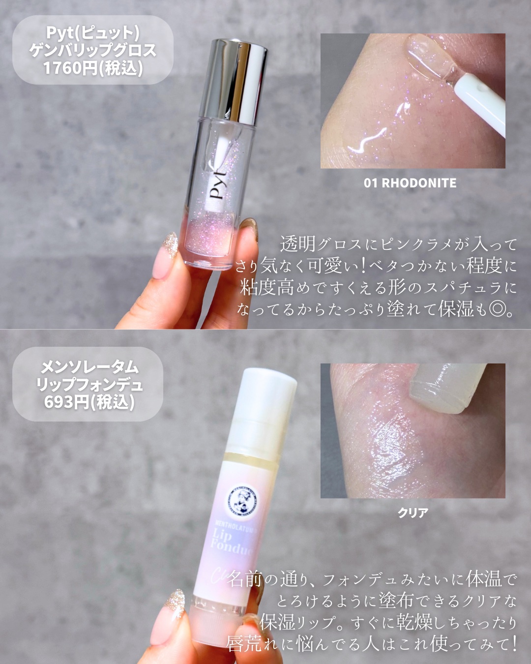 今回の新色がブルベ激アツな件🔥💓売り場が可愛過ぎて買う予定全くなかったのに吸い込まれてった(笑)テスターしたらマジで可愛くて即決だった。とりあえず2色厳選して大満足❤️やっぱこのとろ〜り感好きだわ〜!🤭唇の皮剥けとか乾燥すごいタイプなんだけ...
