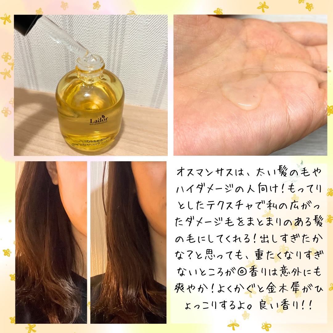 LADOR髪に塗る香水🤍ラドールのパフュームヘアオイル。今までHinokiを使ってたんだけど、新たにOsmanthus(オスマンサス)を使ってみたよ...♪*゚\続く香りとツヤ/🤍LADORパフュームヘアオイル Osmanthus✔︎ハイダメ...