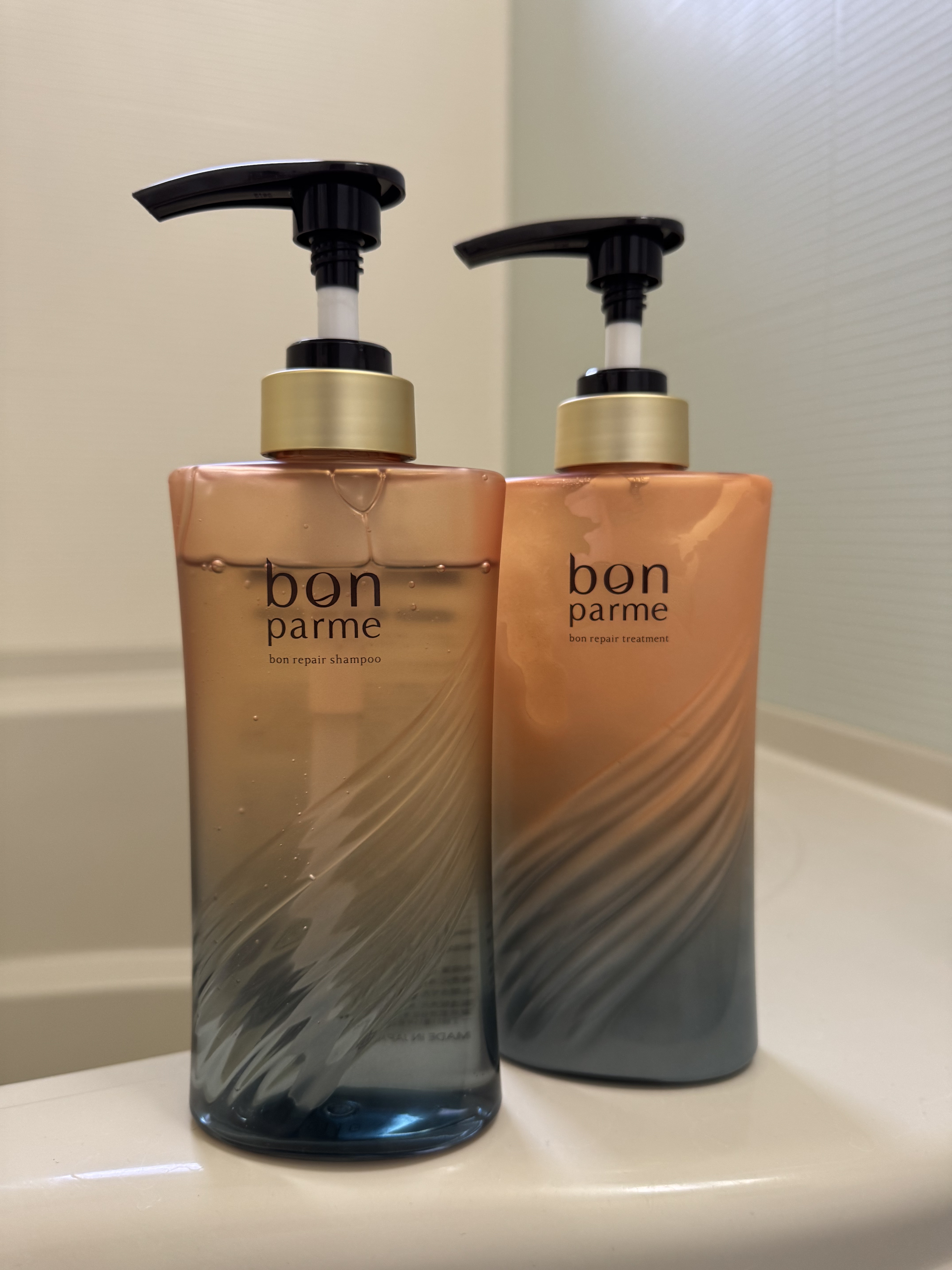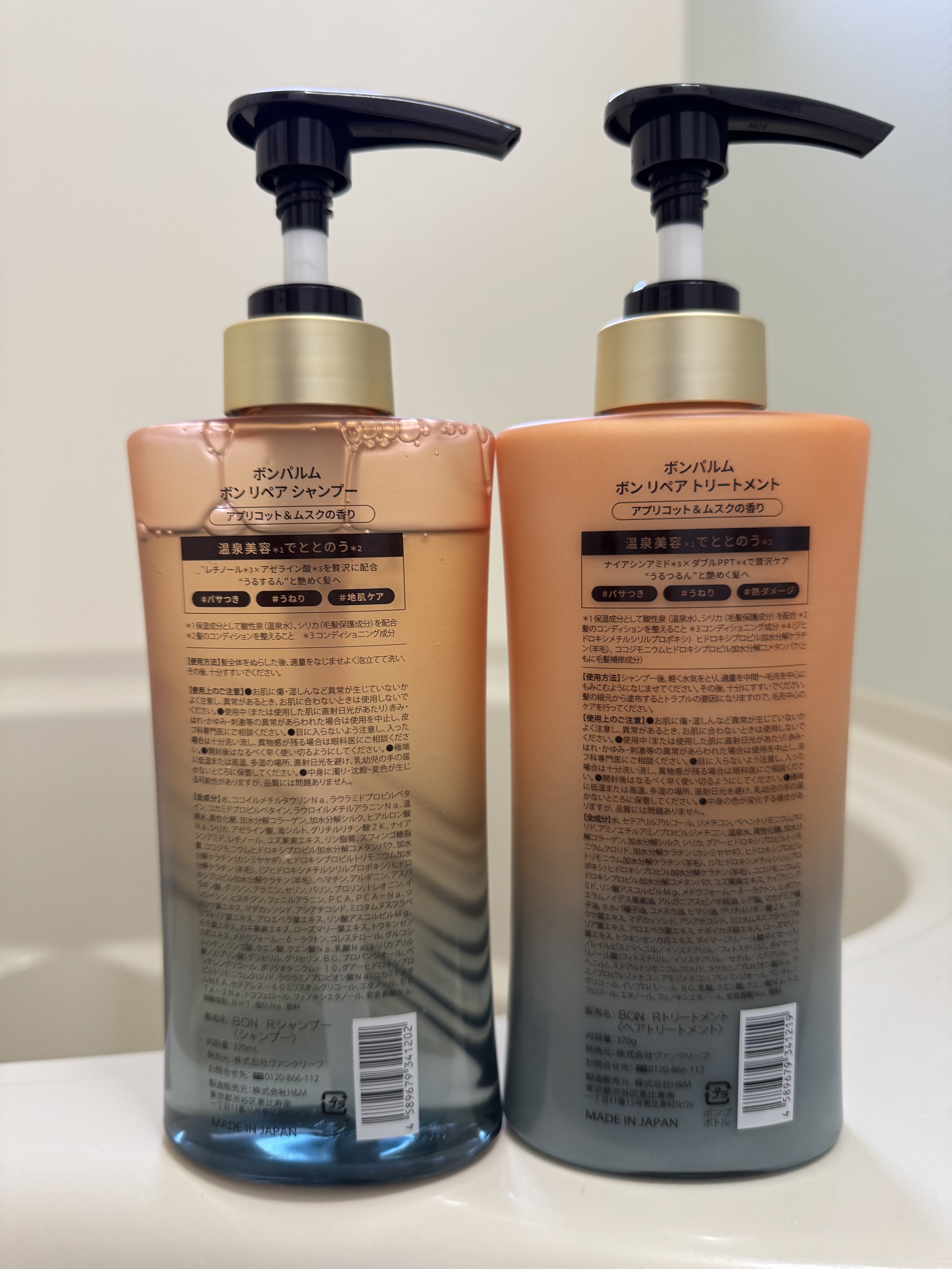 bonparme/ボンリペアシャンプー/トリートメント 一回使っただけで髪がさらさらまとまりがでました。アプリコット&ムスクの香りで癒されます。日中にもふわっと香るので好きです。濃密トリートメントで毛先までスルンとまとまります...
