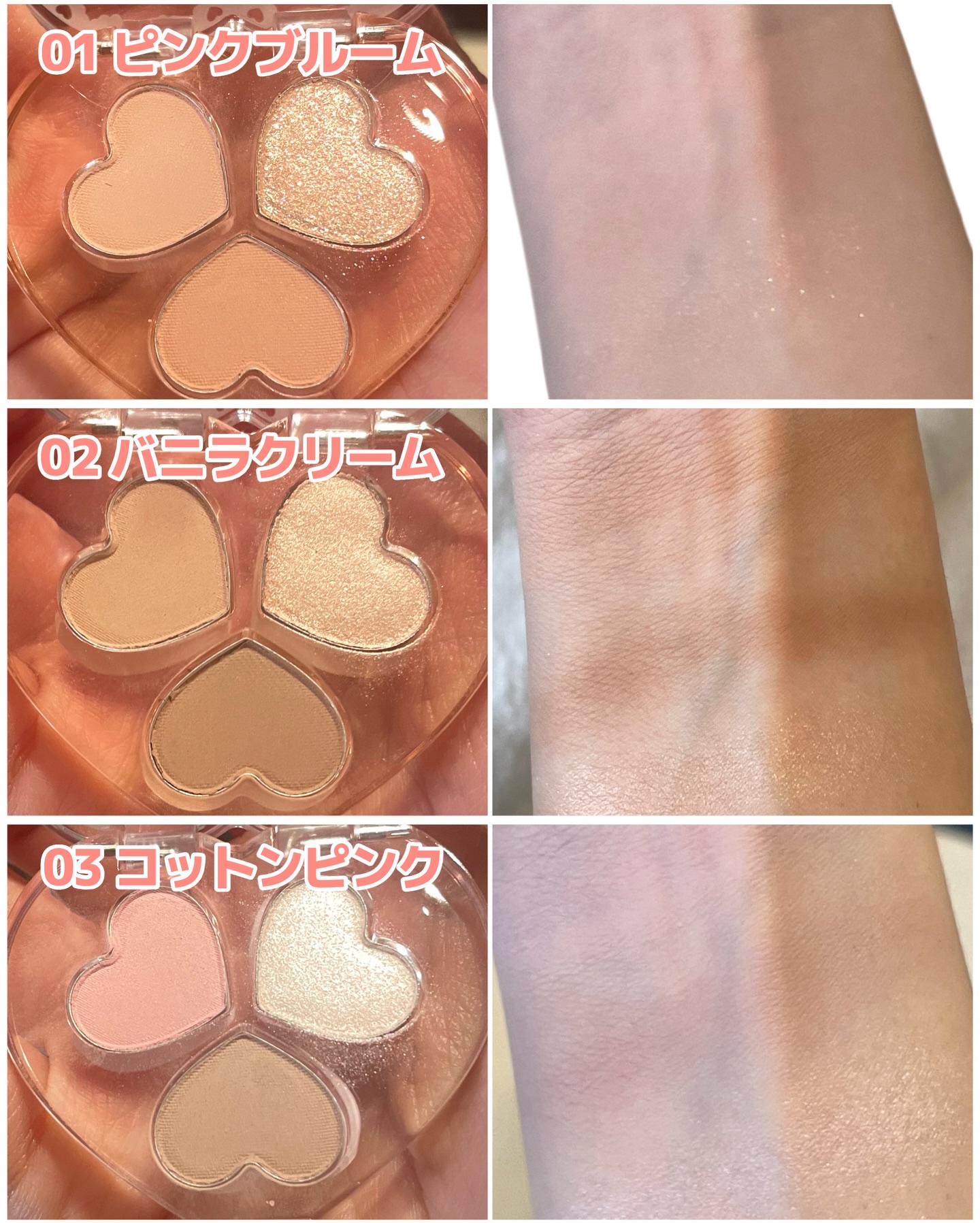 \セブン-イレブン限定♡ミニコスメ/from2aNラブクローバーパレット01ピンクブルーム02バニラクリーム03コットンピンク04トロピカルラブ05ブルーミングライラック06ピンクシャワー持ち運びに便利なサイズ感でハート型が可愛い3色アイシャ...