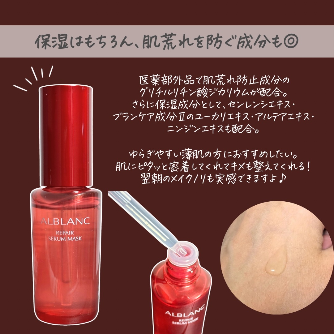 - 【医薬部外品】 リペア セラムマスクは、肌に絡みつくように密着。 有効成分で肌荒れを防ぎます。 また、アルブラン独自の美容成分(保湿)配合で乾燥を防止します。 角層の機能の働きを助け、一滴でキメの整った健やかな肌に保ちます。