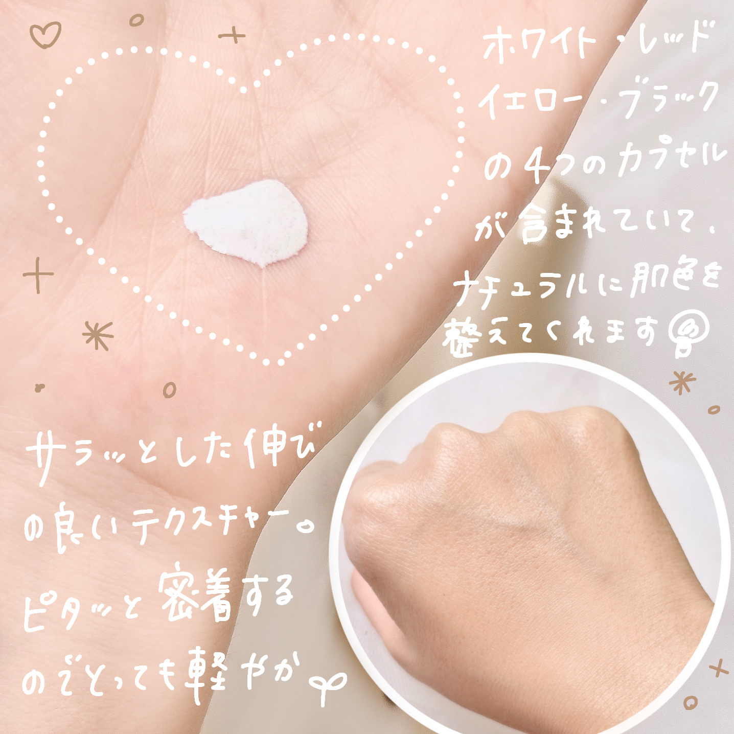 - ファンデーション+日焼け止め+ローションの3つの機能が一度にできる トーンアップ*ローション 浮きにくくナチュラルな仕上がり 8重ヒアルロン酸(保湿)、シカ(ツボクサ)整肌成分、毛穴ケア(保湿)成分含有 ワンカラーで(4色のカプセル配合) 肌に合わせて自然に補正*される トーンアップローション *メイク効果による