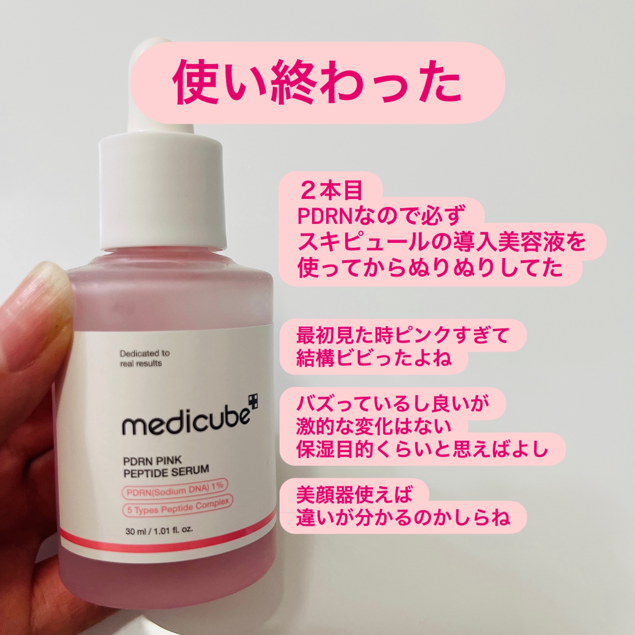 MEDICUBEのPDRNピンクのアンプルです。使い終わった画像ですみません。この子は2本目で、保湿感が好きです。初見だとみんなびっくりするくらい夢かわピンク。香りは好き嫌いありそうだけど、私的にはずっと使っていれば慣れました。好きとはいえな...