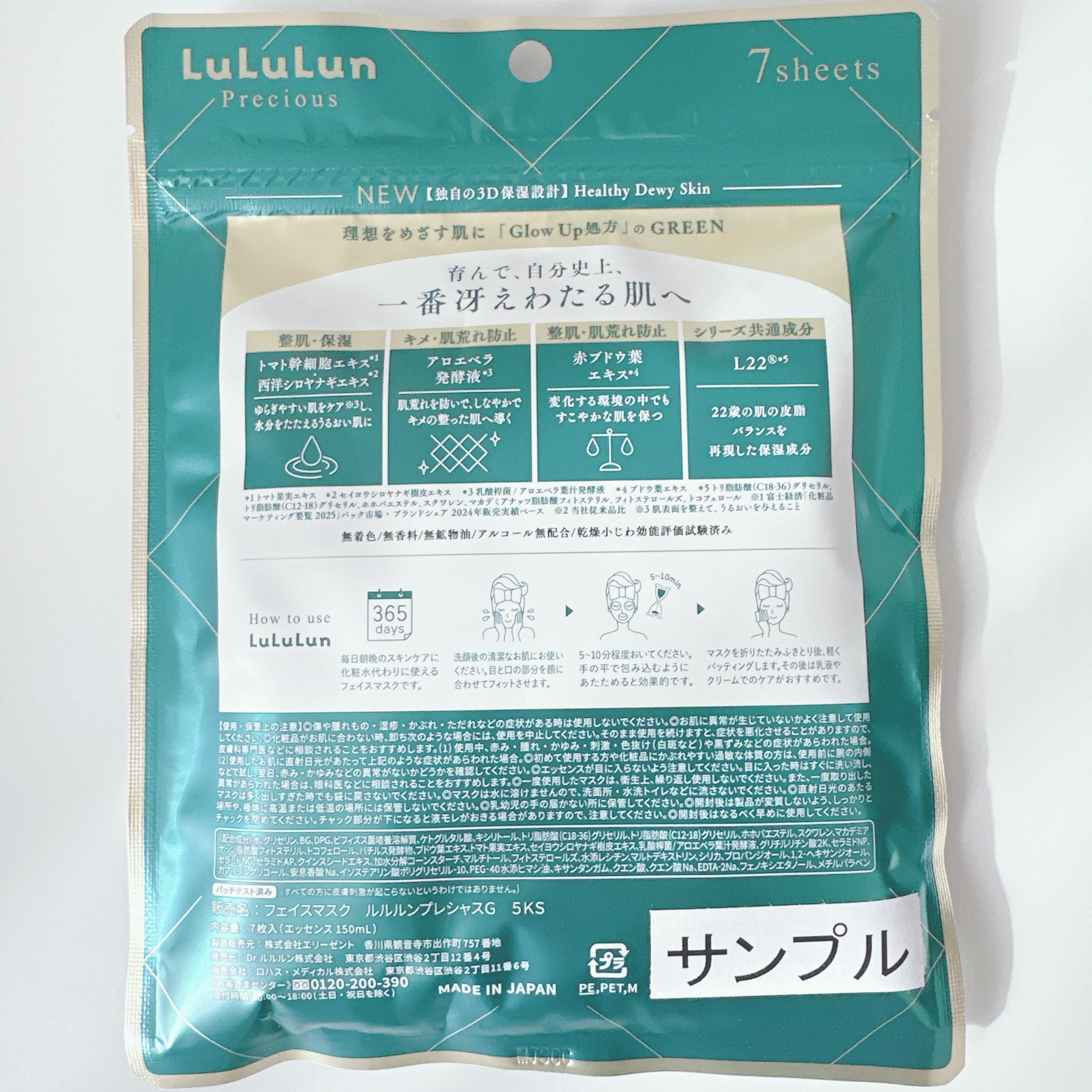 - <ルルルンプレシャス GREEN(Glow up)32枚入> 水、グリセリン、BG、DPG、ビフィズス菌培養溶解質、ケトグルタル酸、キシリトール、トリ脂肪酸(C18-36)グリセリル、トリ脂肪酸(C12-18)グリセリル、ホホバエステル、スクワレン、マカデミアナッツ脂肪酸フィトステリル、トコフェロール、バチルス発酵物、ブドウ葉エキス、トマト果実エキス、セイヨウシロヤナギ樹皮エキス、乳酸桿菌/アロエベラ葉汁発酵液、グリチルリチン酸2K、セラミドNP、セラミドNG、セラミドAP、クインスシードエキス、加水分解コーンスターチ、マルチトール、フィトステロールズ、水添レシチン、マルトデキストリン、シリカ、プロパンジオール、1,2-ヘキサンジオール、カプリリルグリコール、安息香酸Na、イソステアリン酸ポリグリセリル-10、PEG-40水添ヒマシ油、キサンタンガム、クエン酸、クエン酸Na、EDTA-2Na、フェノキシエタノール、メチルパラベン <ルルルンプレシャス GREEN(Glow up)7枚入> 水、グリセリン、BG、DPG、ビフィズス菌培養溶解質、ケトグルタル酸、キシリトール、トリ脂肪酸(C18-36)グリセリル、トリ脂肪酸(C12-18)グリセリル、ホホバエステル、スクワレン、マカデミアナッツ脂肪酸フィトステリル、トコフェロール、バチルス発酵物、ブドウ葉エキス、トマト果実エキス、セイヨウシロヤナギ樹皮エキス、乳酸桿菌/アロエベラ葉汁発酵液、グリチルリチン酸2K、セラミドNP、セラミドNG、セラミドAP、クインスシードエキス、加水分解コーンスターチ、マルチトール、フィトステロールズ、水添レシチン、マルトデキストリン、シリカ、プロパンジオール、1,2-ヘキサンジオール、カプリリルグリコール、安息香酸Na、イソステアリン酸ポリグリセリル-10、PEG-40水添ヒマシ油、キサンタンガム、クエン酸、クエン酸Na、EDTA-2Na、フェノキシエタノール、メチルパラベン