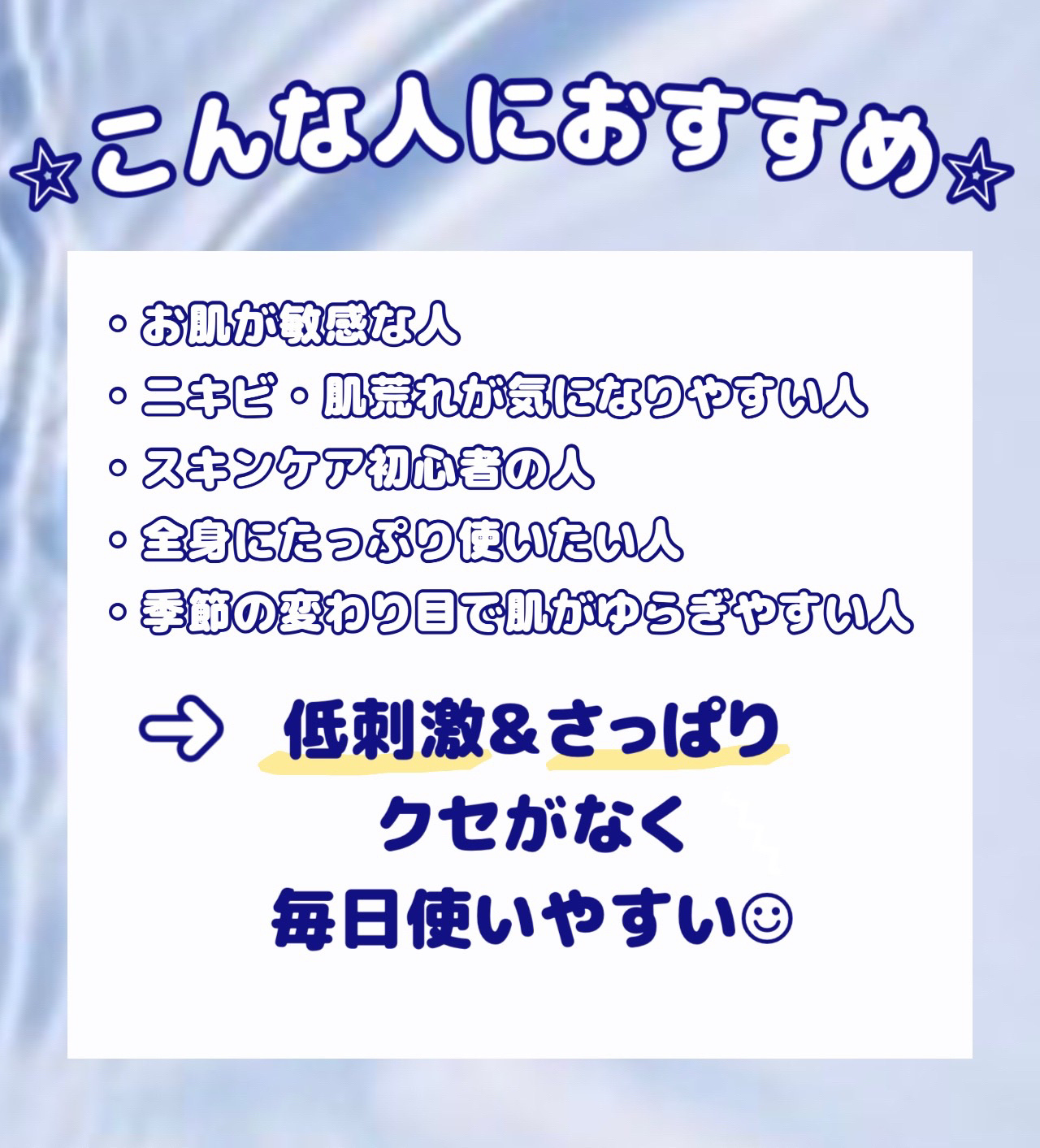 みずみずしく浸透力に優れた処方なので、重ねるほどぐんぐん肌になじみ、角層を水分で満たします。 たっぷり肌に重ねづけしてもべたつかない、さっぱりした使用感です。 大容量なのでボディーにも惜しみなく使ってます!