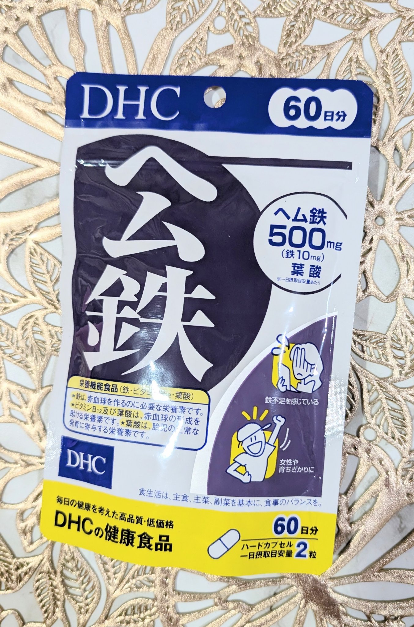 - 「ヘム鉄」は、とりわけ女性に不足しがちな鉄分を効率よく補えるサプリメントです。鉄分は身体への吸収率が悪く、カルシウムと並び積極的に補給したいミネラルの1つです。 さらに、ビタミンB12、葉酸をプラス。鉄不足が気になる方や、育ちざかりの方におすすめです。 栄養機能表示 ●鉄は、赤血球を作るのに必要な栄養素です。 ●ビタミンB12及び葉酸は、赤血球の形成を助ける栄養素です。 ●葉酸は、胎児の正常な発育に寄与する栄養素です。 ※本品は、多量摂取により疾病が治癒したり、より健康が増進するものではありません。一日の摂取目安量を守ってください。 ※葉酸は、胎児の正常な発育に寄与する栄養素ですが、多量摂取により胎児の発育が良くなるものではありません。 ※本品は、特定保健用食品と異なり、消費者庁長官による個別審査を受けたものではありません。 ※水またはぬるま湯でお召し上がりください。 【名称】 ヘム鉄加工食品 【原材料名】 ヘム鉄、ゼラチン、グリセリン脂肪酸エステル、セルロース、着色料(カラメル、酸化チタン)、微粒二酸化ケイ素、葉酸、ビタミンB12 【栄養成分表示[2粒692mgあたり]】 熱量2.8kcal、たんぱく質0.48g、脂質0.07g、炭水化物0.06g、食塩相当量0.025g、鉄10.0mg(147)、葉酸75μg(31)、ビタミンB12 1.0μg(42) *鉄はヘム鉄として500mg配合しています。 上記( )内の値は、栄養素等表示基準値(18歳以上、基準熱量2200kcal)に占める割合[%]です。 【飲み方】 一日の摂取目安量2粒 アレルギー物質 ゼラチン ※一日の目安量を守って、お召し上がりください。 ※お身体に異常を感じた場合は、摂取を中止してください。 ※特定原材料及びそれに準ずるアレルギー物質を対象範囲として表示しています。原材料をご確認の上、食物アレルギーのある方はお召し上がりにならないでください。 ※薬を服用中あるいは通院中の方、妊娠中の方は、お医者様にご相談の上お召し上がりください。 ●直射日光、高温多湿な場所をさけて保存してください。 ●お子様の手の届かないところで保管してください。 ●開封後はしっかり開封口を閉め、なるべく早くお召し上がりください。 食生活は、主食、主菜、副菜を基本に、食事のバランスを。