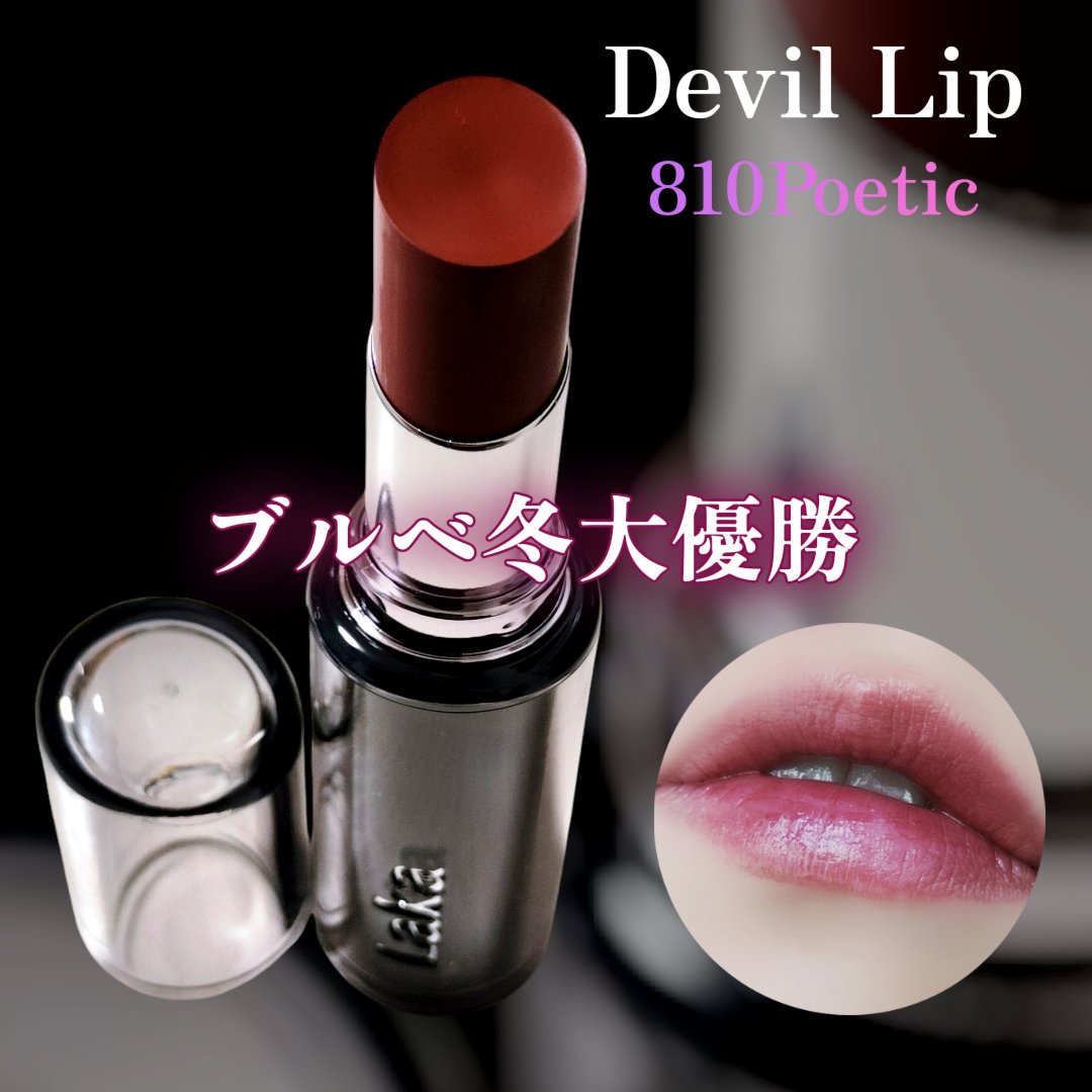 ♡Lakaデビルリップ810Poeticポエティック1980円メガ割購入品です!楽しみにしてたデビルリップ😈♡蓋を開けると、思ったより青み少ない?と思いました。手に塗ってみても、深みレッドという感じでパープルみはあまり感じられず。唇に乗せると...
