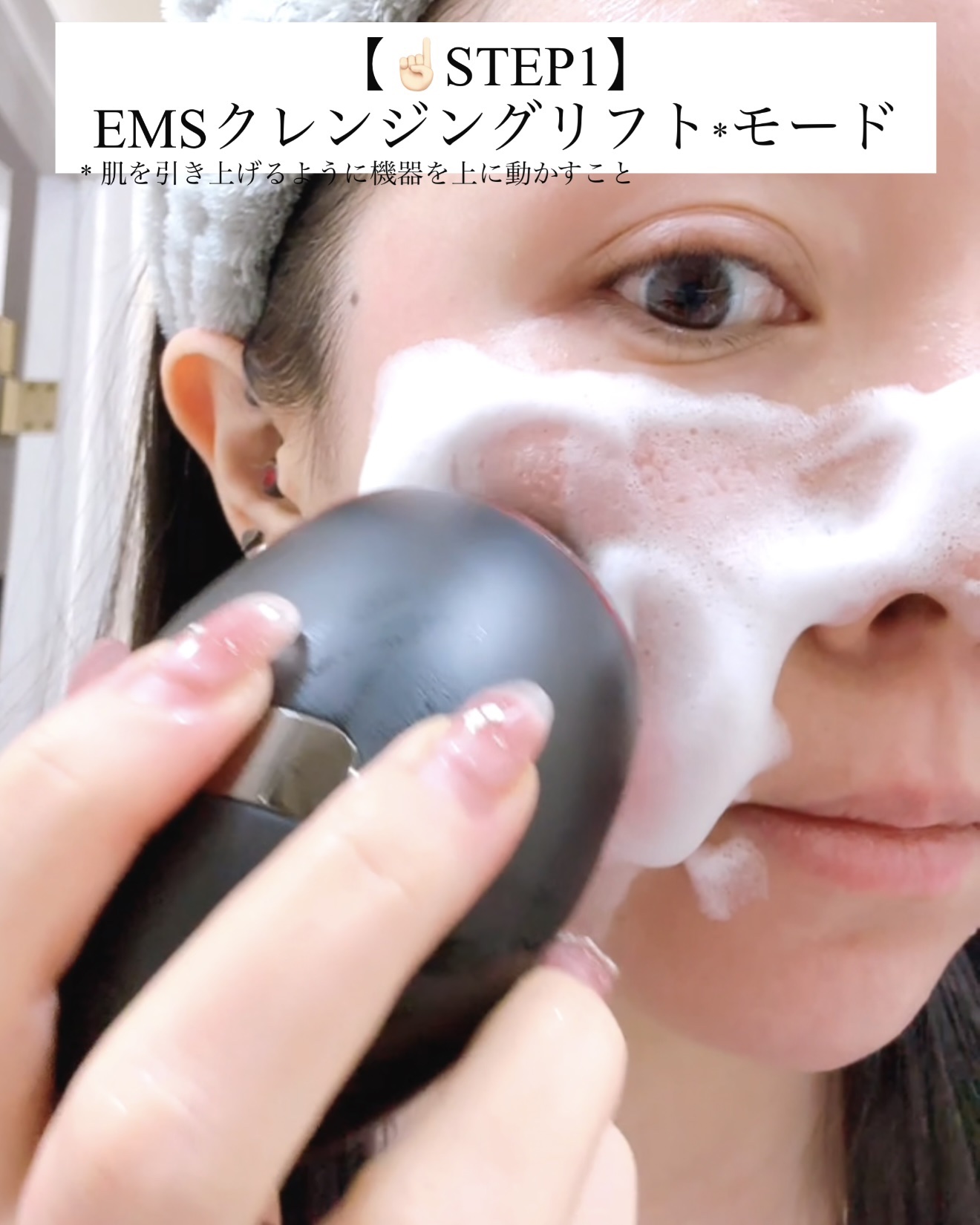 - STEP1.EMSクレンジングリフト※2モード 本モードは、直径0.7mmの極細毛と、毎分約11,000回の音波振動によって、手洗顔では落としきれない皮脂や角栓などの汚れを擦らず優しく浮かせ、毛穴汚れをスッキリ除去します。また、EMSで表情筋を刺激することで、フェイスラインやたるみ毛穴を引き上げ※2ます。 ✔ クレンジングのポイント ①音波振動で擦らず汚れを除去 毎分約11,000回の音波振動が汚れを擦らず優しく浮かせます。また角質層の約1/4ほどの薄さといわれる卵黄膜も破れないほどの優しい刺激です。 ②日本初※1の可動式ヘッド 細かな箇所にも左右にフィットする可動式ヘッドで、当てづらい小鼻やフェイスラインなどの曲線に対してもぴったりフィットします。 ③特許構造の独立型コア 振動部が本体中心部ではなく独立ヘッド部にあるため、振動の力が分散されず、ダイレクトに伝わります。 ✔ リフトケアのポイント ①360本の導電性 シリコンブラシ 直径わずか0.7mmの極細毛で、撫でるような洗顔をサポート。柔軟性があり、顔の凹凸にフィットしやすいため、電流を効率的に肌に伝えます。密着度が高く、EMSの効果を引き出せます。 ②EMSで顔を引き上げ※2ながら毛穴のエイジングケア※4 洗顔時に滑らかな肌触りで毎日使いやすいEMSを採用。 刺激が苦手な人も使いやすいよう、弱、中、強のレベルを設定し使用することが可能です。 電気刺激によりフェイスラインを引き上げ※2ながら、開いたたるみ毛穴のエイジングケア※4も叶えます。 STEP2.イオン導出ディープ※3クレンジングモード 週1~2回のイオン導出で、自宅でディープクレンジングができる機能です。プラスイオンの力で、マイナスに帯電している毛穴の奥に蓄積した皮脂や汚れを吸着。感覚振動の軽いタッチで毛穴の汚れを浮かして落とします。 STEP3.イオン導入※3モイストモード イオン導入とタッピングで汚れを落としたまっさらな肌に美容成分を浸透※3させ、ハリツヤのある肌へ整えます。アウトバスで、化粧水・美容液などを塗布した後にご使用ください。 *1 肌を柔らげ、整える成分 ※2 肌を引き上げるように機器を上に動かすこと ※3 角層まで ※4 年齢に応じたお手入れ ✔ 約150gのコンパクトサイズ 片手で簡単に操作ができて、幅を取らないコンパクトサイズ。旅行などの持ち運びもOKです。 ✔ IPX7の防水企画でお手入れ簡単 お風呂場で洗える防水仕様です。流水で水洗いできるため、衛生面も安心です。 ✔ 大容量バッテリー 2時間のフル充電で約50回、1日1~2回のご使用で、約1か月お使いいただけます。