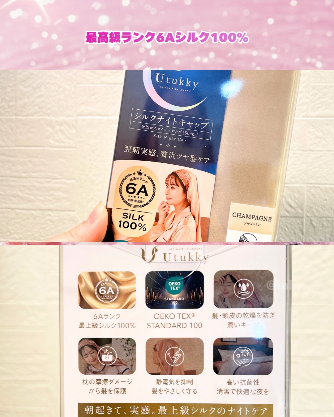 🏷︎⸝⋆PRUtukky@utukky_japanシルクナイトキャップフーディタイプシルク100%スナップボタン×紐タイプカラーシャンパン×アイボリーナイトキャップって朝になったら脱げちゃってることも多かったんだけどこれは首元のリボンで絞っ...