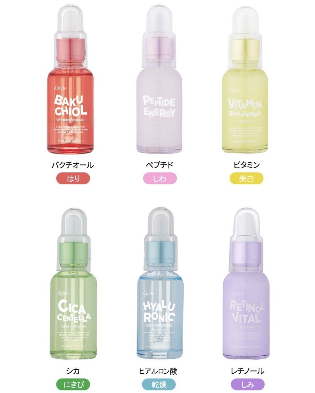 - 韓国で話題のコスメブランド 「エスフォリオ」の選べる美容セラム6種類 天然由来の成分を使用し、お肌のことを考えた処方になっています。 ご自身のお肌の状態に合わせてお選びください。 「ペプチドエナジー」 弾力感とハリのある生き生きとした肌印象へと導きます。ハリケアや整肌ケアを期待できる美容セラムです 2種類のペプチド配合。 アセチルヘキサペプチド*1が目元にハリを与えます。 分子量が小さいトリペプチド*1は浸透力*2が高くお顔全体のハリや弾力をケアします。 バリア機能をサポートするアデノシン*1やカタツムリ分泌液*1を配合。 パルミチン酸レチノール*も配合しエイジングケア*3をサポートします。 *1整肌成分 *2角質層まで *3年齢に応じたお手入れ