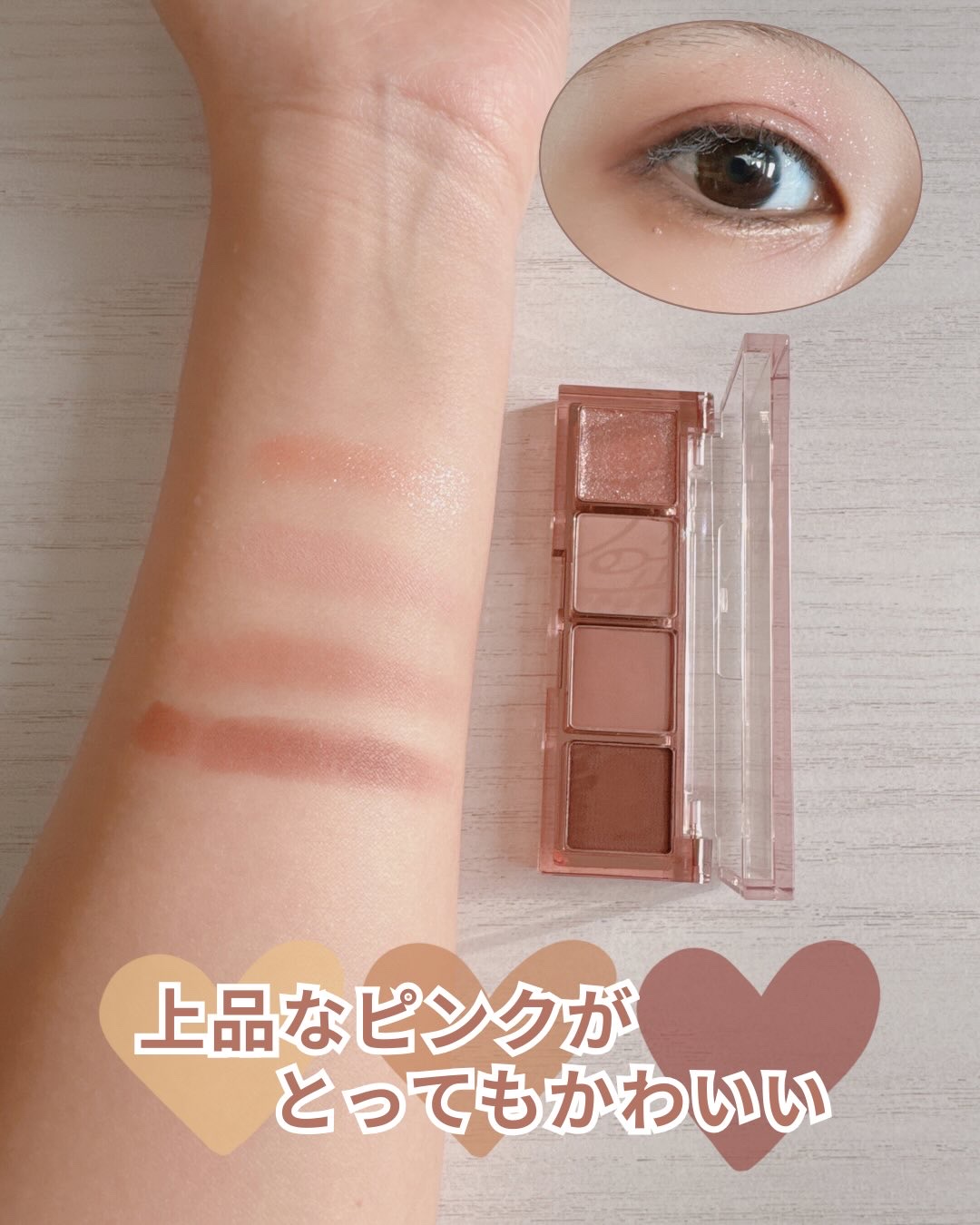 - 底が見えるまで使いたい!本命カラーパレットでパーフェクトEYE デイリーから盛りメイクまでワンパレットで完成するアイシャドウパレットです。 ベース、ミディアムカラー、締め色、ポイントグリッターの4色で構成されており、持ち運びにも便利なサイズ感となっています。