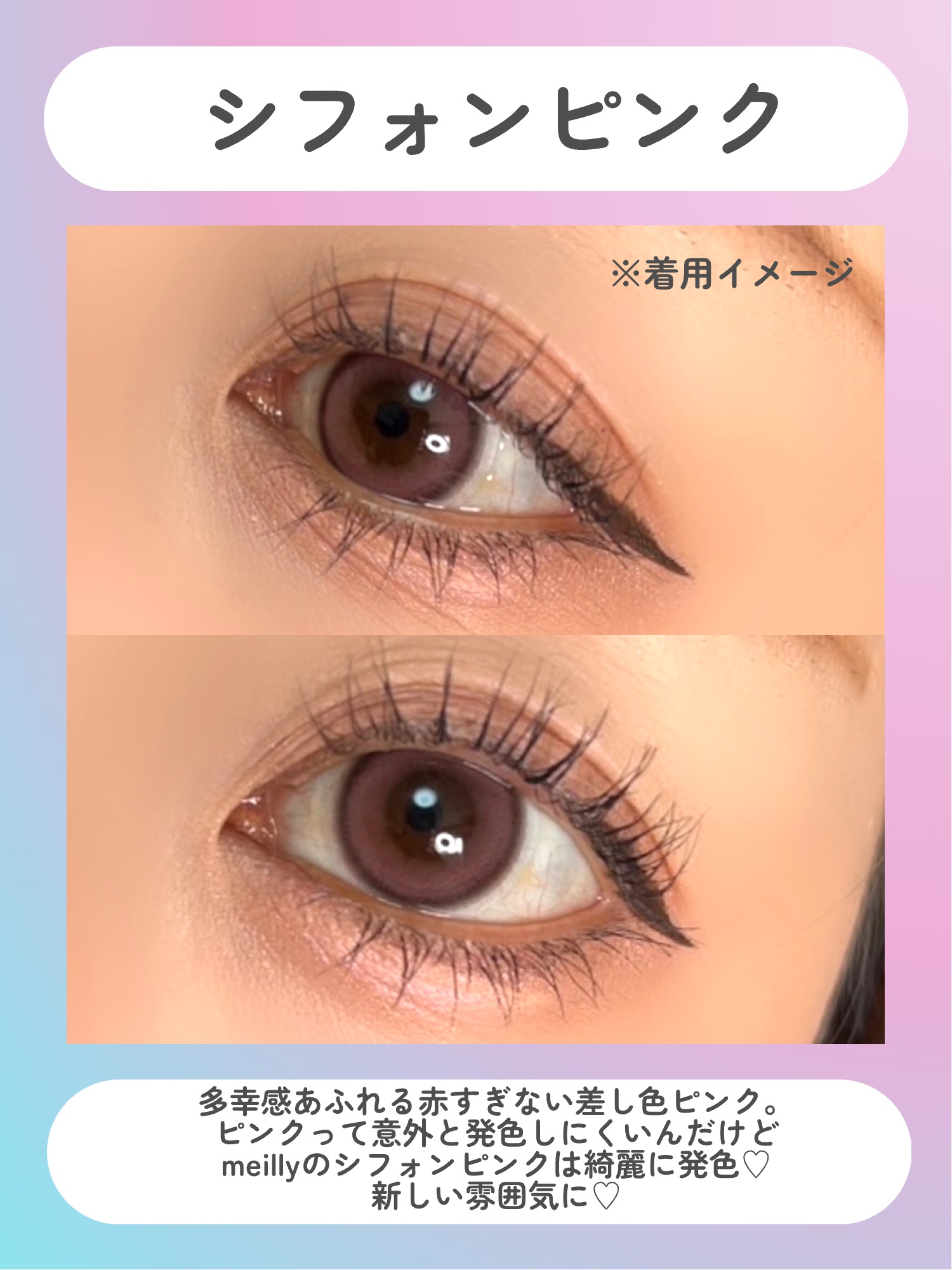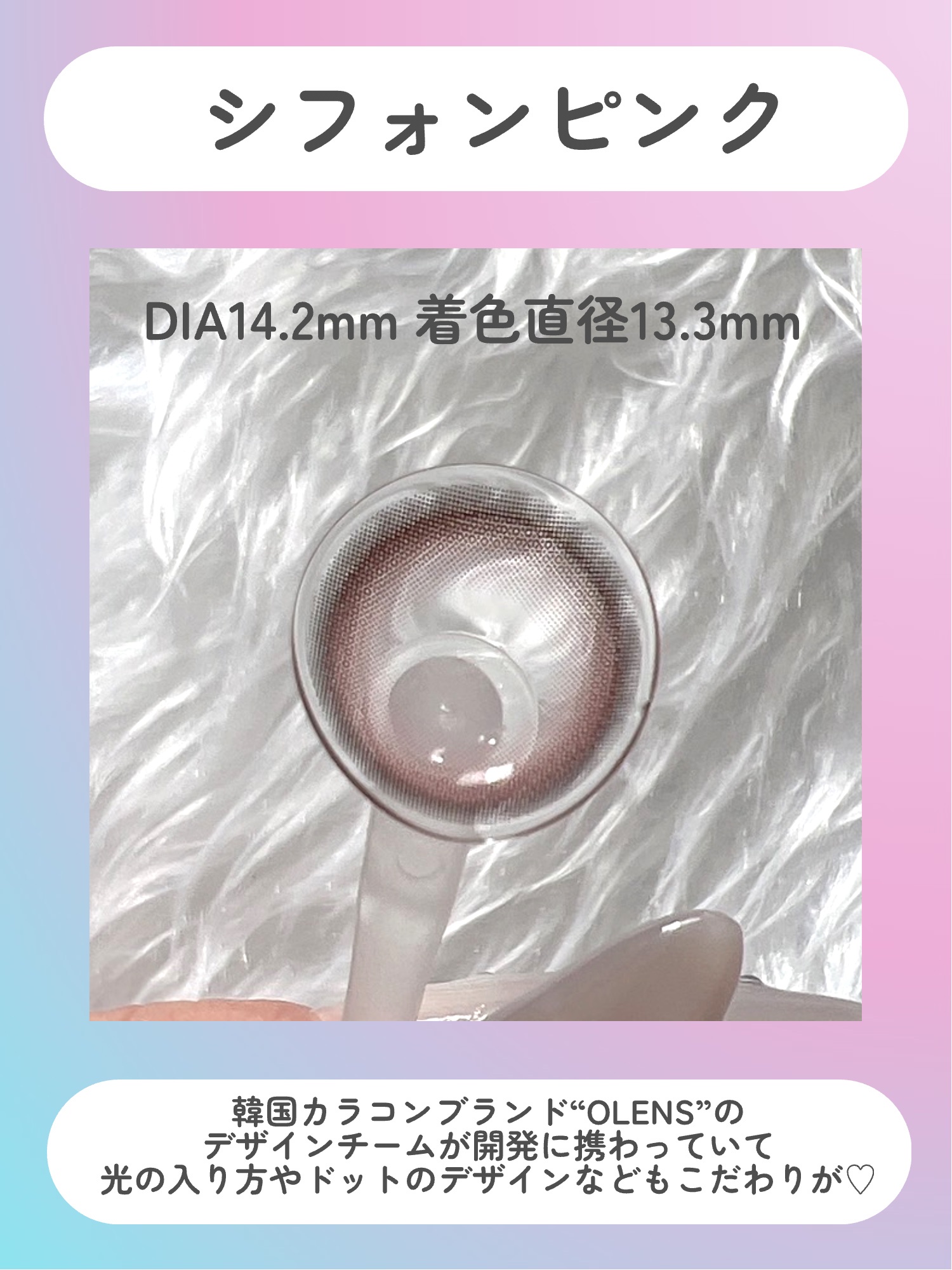 - 瞳をドレスアップ 森香澄推しカラー「chiffon pink」ついに誕生!! 幸せをまとう大人かわいいあざとレンズ ”多幸ピンク” ・ウワサPOINT1:たった3秒で印象チェンジ!奇跡のスッピンアップデート ・ウワサPOINT2:韓国で話題のカラコンブランドがデザインをバックアップ ・ウワサPOINT3:どんな日本人女性にも合うこだわりのバランス、着ける人を選ばない◎ ・まるでシフォンドレスをかぶせたような柔らかく自然なトーンアップデザイン ・2トーンカラーのグラデーションで奥ゆかしい瞳へ ・長時間着けても乾きにくい低含水処方(38.5%) ・全4色 chiffon brown / chiffon beige / chiffon gray / chiffon pink 使用上の注意 〇このレンズは1日使い捨てコンタクトレンズです。 〇ご使用の前に必ず添付文書をよく読み、正しくお使いください。 〇眼科での定期検査を受けてください。 〇目に異常を感じたら直ちにレンズの装用を中止し、眼科医の受診を受けてください。