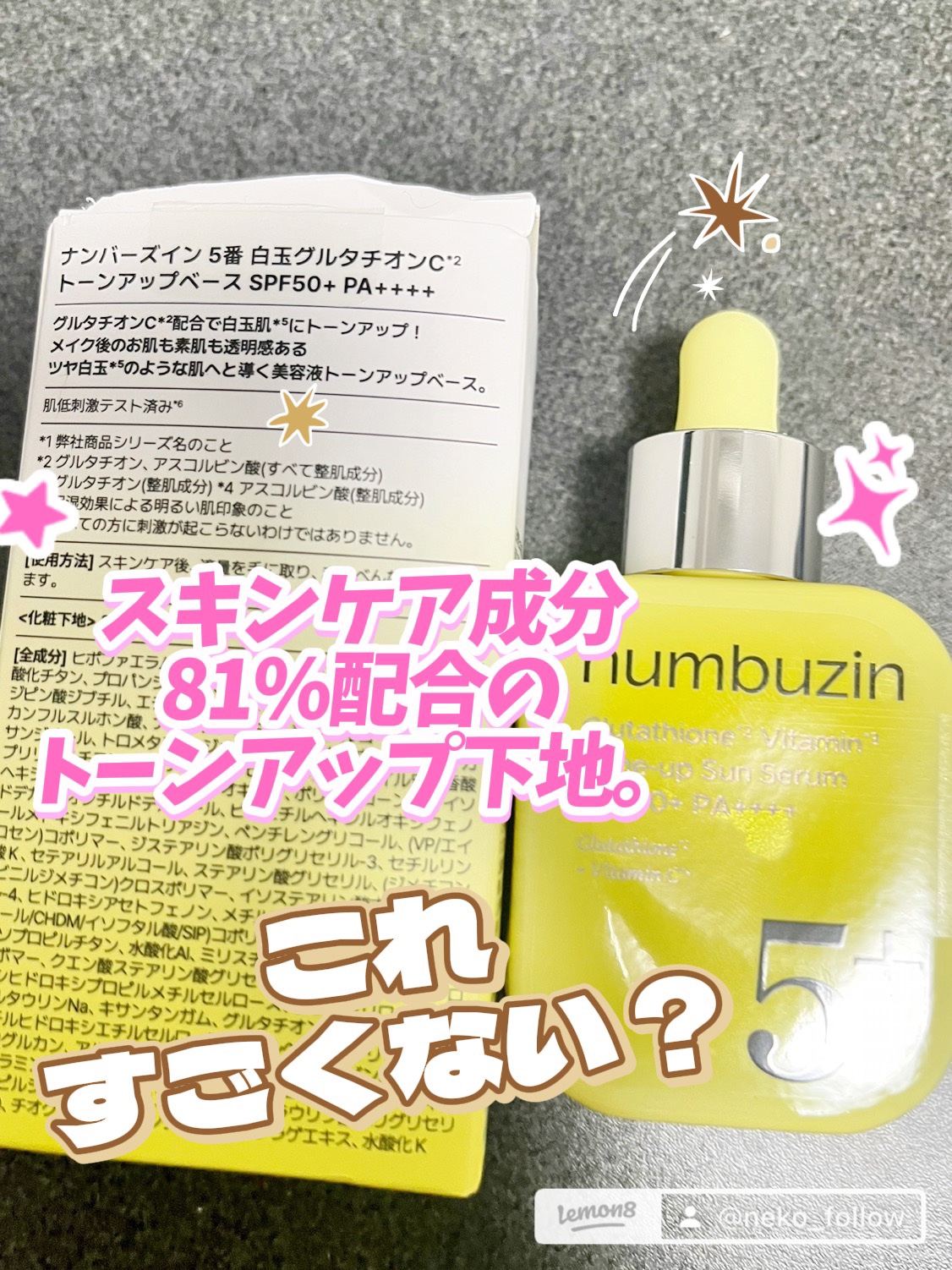 numbuzin💛No.5+トーンアップベース🟡:30ml🟡:SPF50+/PA++++🟡:グルタチオン、ビタミンC🟡:化粧下地・日焼け止めにも❕・トーンアップ効果肌のくすみをカバーし、自然に明るい印象の肌に整えてくれる✨️...