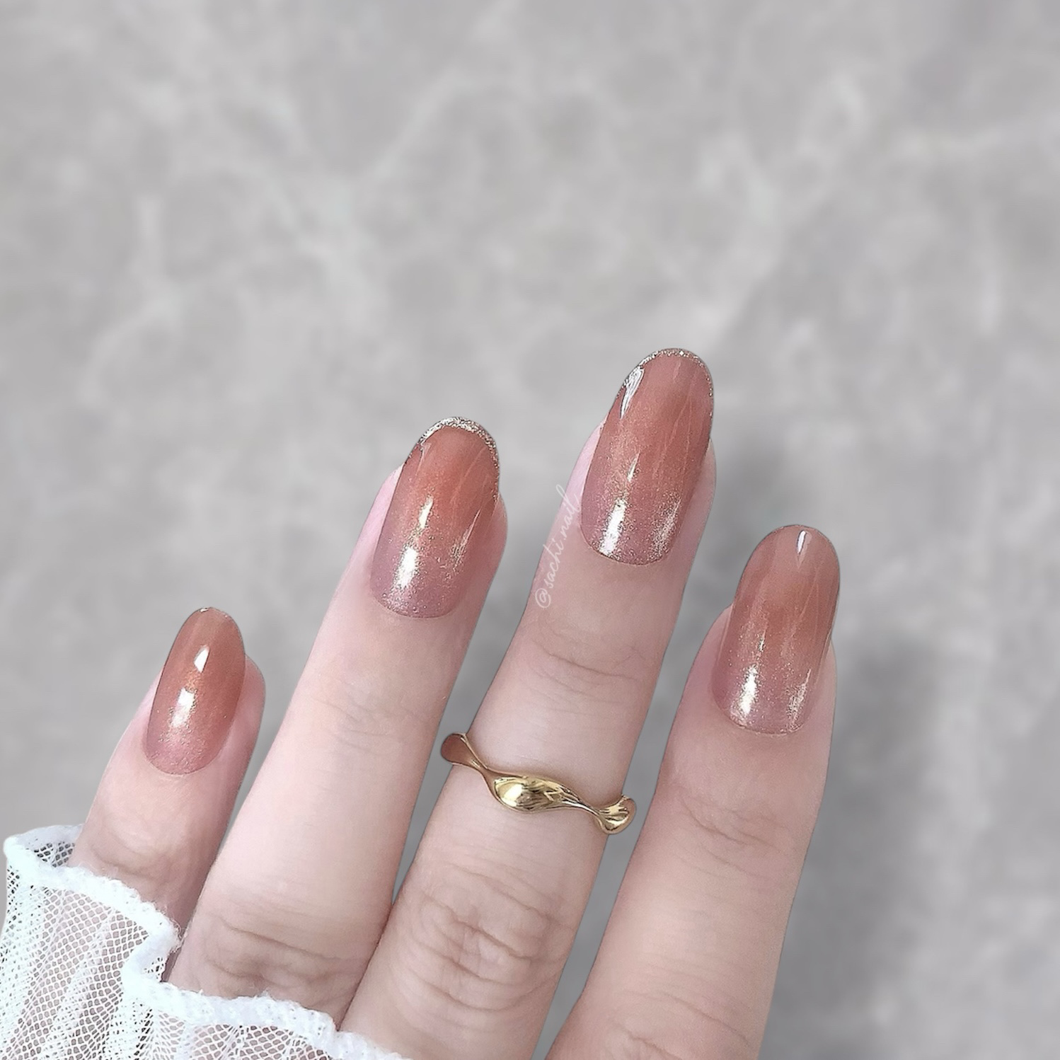 ワンカラーでも指ごとに色を変えるだけでオシャレに見えます💕 画像のようにゴールドラインとストーンを少し足すだけで華やかさがアップ🥰 何度かご紹介したことのあるスポンジで作るグラデーションです✨ スポンジを使うことで境目が綺麗に馴染んでくれます💕 アルミホイルの上でブラウンとトップコートを1:1くらいで混ぜたものを、トップコートのハケに取って3箇所に塗るだけ👌 事前に混ぜたものを塗ることで、爪の上でぼかすより簡単に出来ます💕 ベースカラーが乾く前に点置きしてぼかすことで綺麗にぼかせます✨ スピードが大事なので、使うポリッシュのキャップは全て開けておきましょう😊 天然石のラインはガタガタの方がより天然石っぽく見えるので、ラインを描くのが苦手な方でも大丈夫🙆♀️ 難しそうに見えて、やってみると意外と簡単に出来ます♡
