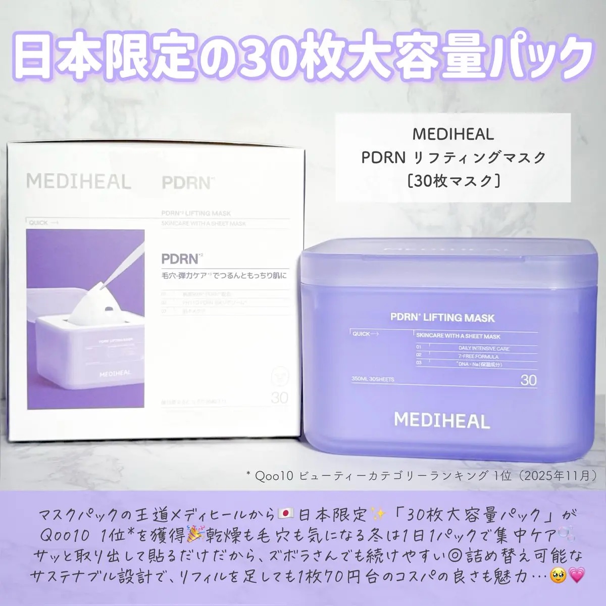 マスクパックの王道メディヒールから、日本限定の「30枚マスクパック」が、Qoo10での1位を獲得🏆️詰め替え可能なサステナブル設計で、繰り返し使えるのはコスパ的にもありがたい◎取り出して貼るだけの手軽さで毎日続けやすいお気に入りアイテム♩※Q...