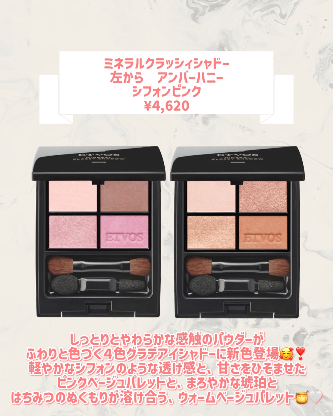 エトヴォス新作情報⟡.·*.··············································⟡.·*.発売日202601/07エトヴォス春コレクション♥ミネラルクラッシィシャドー4.620円♡シフォンピンク♡アンバ...