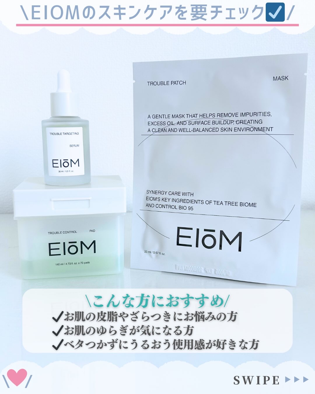 \乳酸菌スキンケアブランドEIOM🤍/汚れが見える!?新感覚のEIOMのニキビパッチマスクで部分ケアではなく“顔全体のケア”😯✨ペタッと貼るだけで密着するコントロールパッドは微生物が絶えず作用して乱れた肌環境を優しくケア❤️セラムは重なる肌...