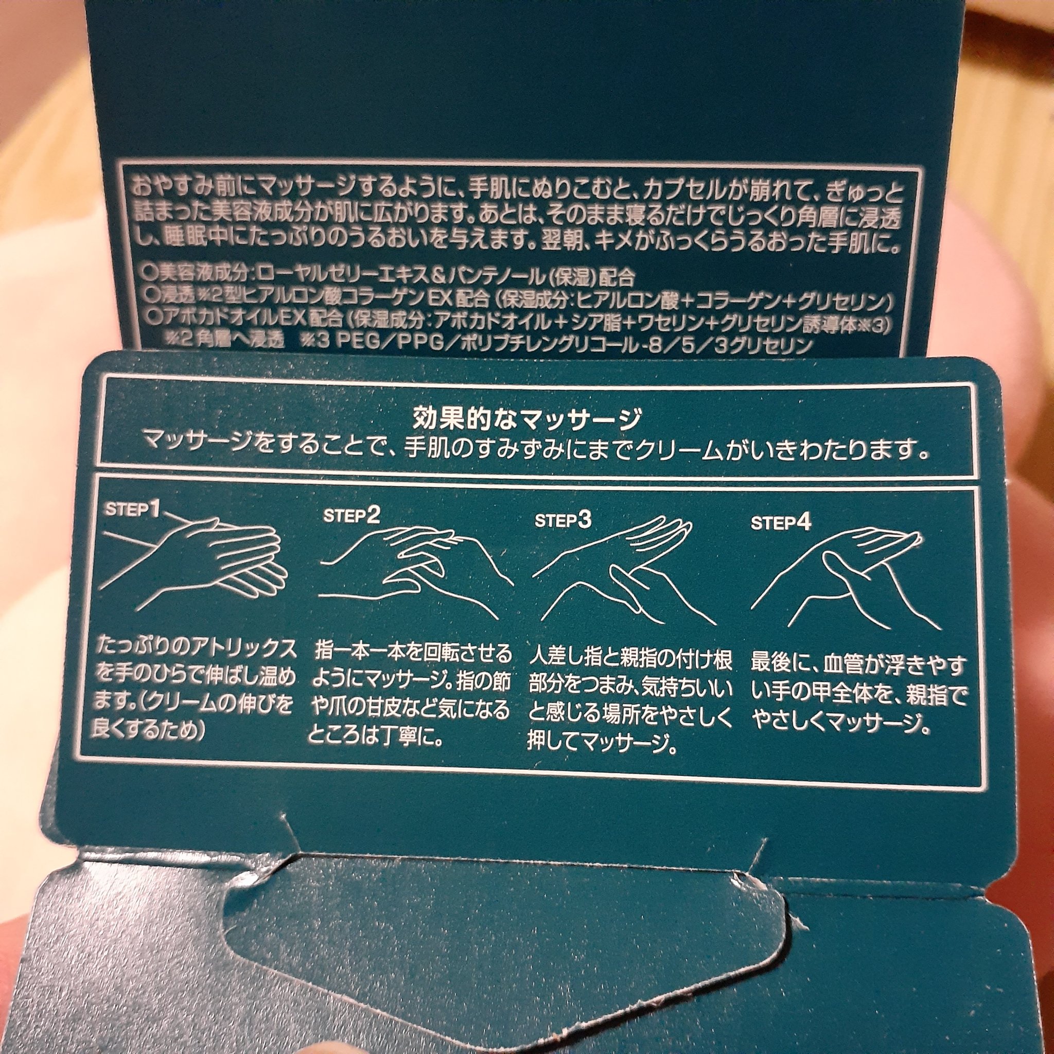 - こっくり濃厚なクリームに、たっぷりの美容液成分がぎゅっと詰まったカプセルを配合。 おやすみ前にマッサージするように手肌にぬりこむと、カプセルが崩れて美容液成分※1が肌に広がります。 夜美容で、寝ている間にじっくり角層に浸透、翌朝ふっくらうるおったハリのある手肌に。 さらに気になる爪・指先までうるおって美しく。ドリーミーアロマの香り。 ※1ローヤルゼリーエキス&パンテノール(保湿成分)