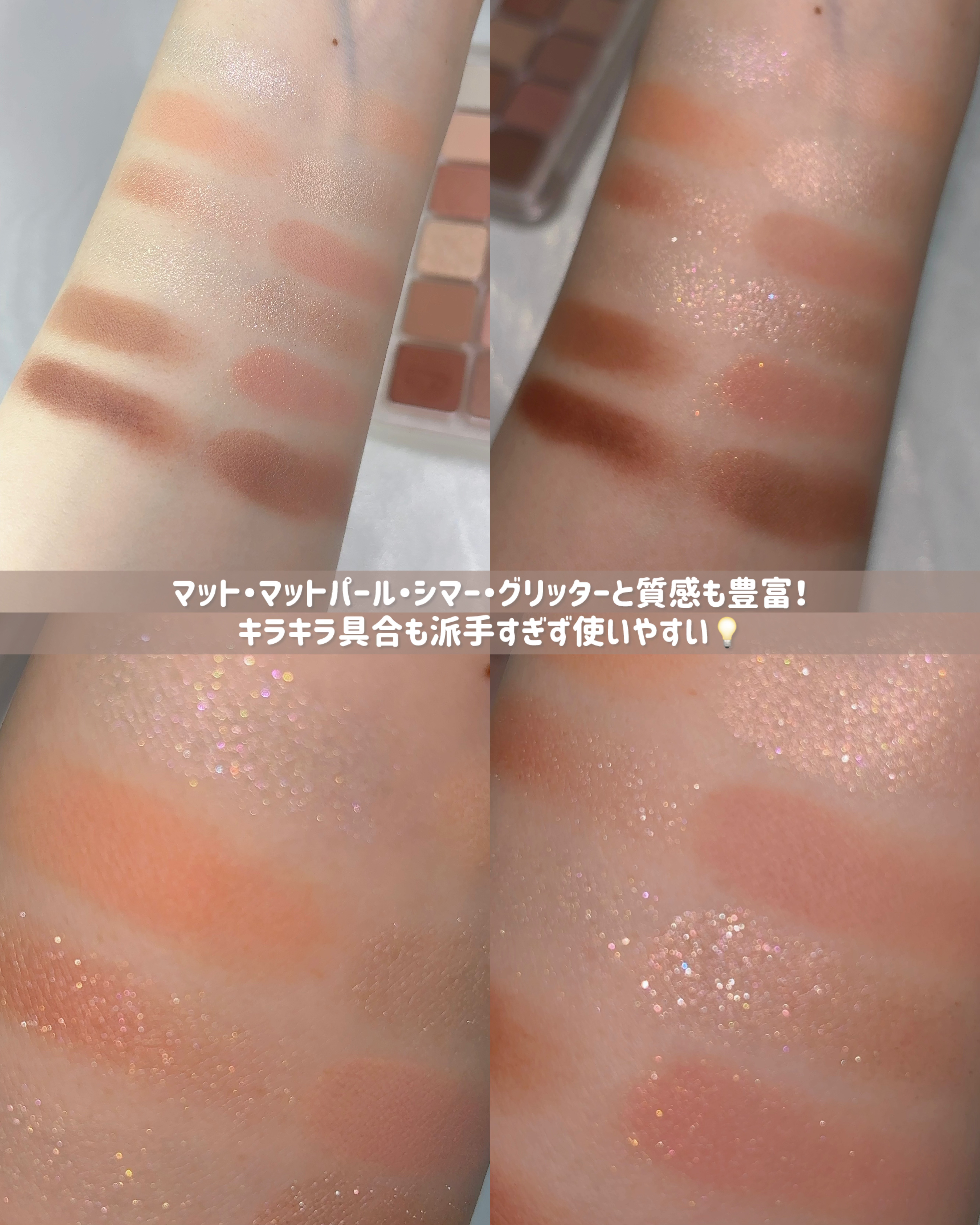 めっちゃくちゃ進化してるーーー😳😳😳 ブラシでも指でも取った瞬間の柔らかさが桁違いに良くなってる!!! ふわっとブレンドしやすくてボカしやすい!!! 05トフィーナッツラテはデイリー使いしやすい ナチュラル発色でかなり自然な仕上がり🥜 今っぽい色味で盛らずに陰影で盛る感じです💗 明度にしっかり差があって陰影をつけやすい◎ 06バニラティーラテはほろ苦ピンクメイクに🎀 05と比較するとかなり強い発色で スモーキーメイクに合いそうなパレット! パレット左から2番目のホワイトラメが ほんとに可愛くて透けるように光る感じ💎