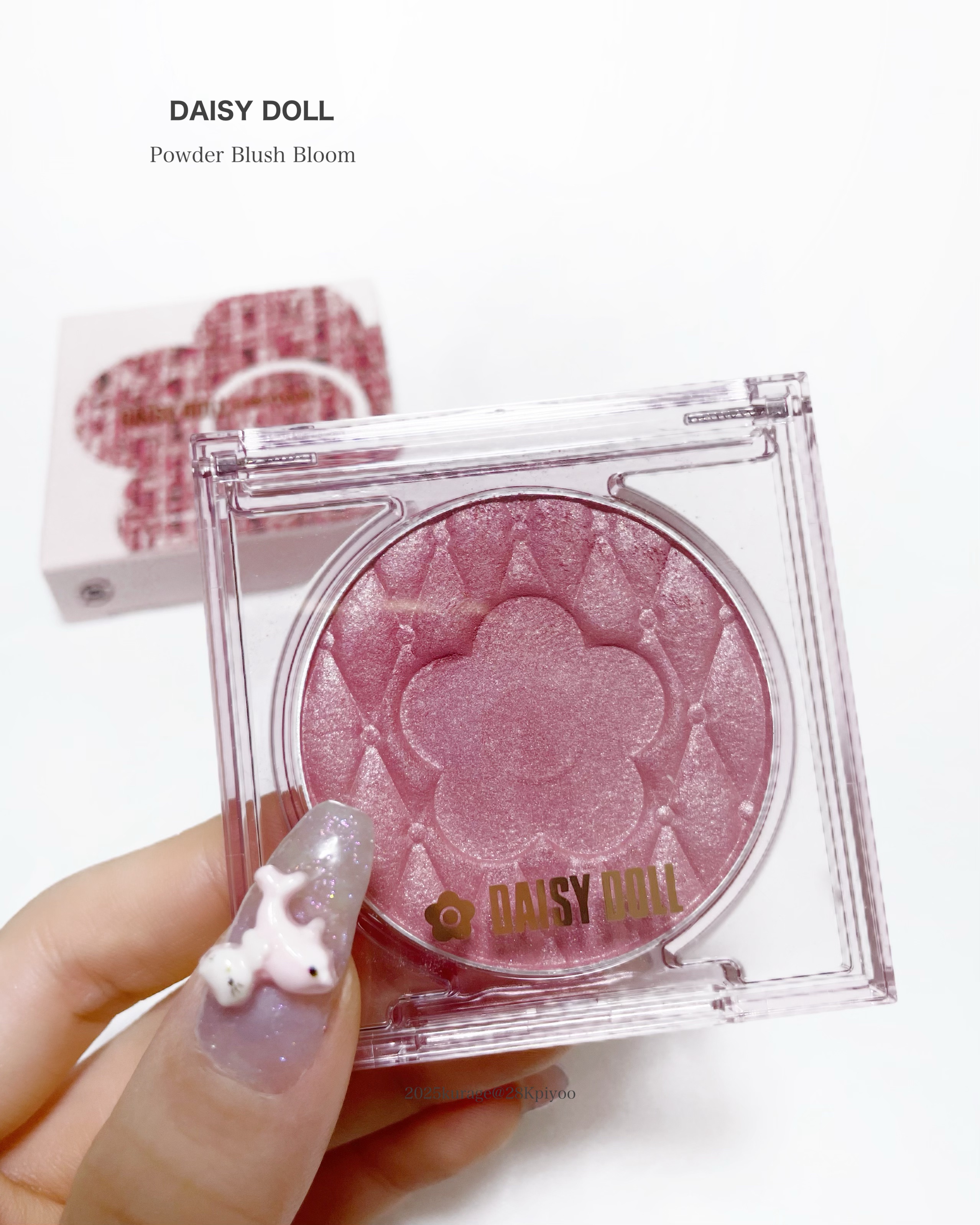 - 25年秋、チーク新色2色と、初のハイライト2色が登場!どちらもデイジーマークとキルティングのエンボス加工を施したガーリーなデザインです。 デイジードール ブランドの中でも人気の高いパウダーブラッシュ ブルームが全9色展開に。 チークは、ふんわり肌に溶け込むように馴染み、血色感を自在に操るしっとり高密着タイプ。 初のハイライトは、異なる偏光パールを配合し、光とツヤ、そして立体感が楽しめます。どちらもしっとりとしたテクスチャーで毛穴など肌の気になる部分をぼかしながら、ふんわりと溶け込むように馴染み、ツヤのある美しい肌を保ちます。 高保湿タイプのトリプル美容オイル*1とうるおい持続パウダー*2配合で、お肌にうるおいを与えます。 *1:ダマスクバラ花油、カニナバラ果実油、アルガニアスピノサ核油(全て保湿成分) *2:シリカ(粉体基剤)、ヒアルロン酸Na(保湿成分)