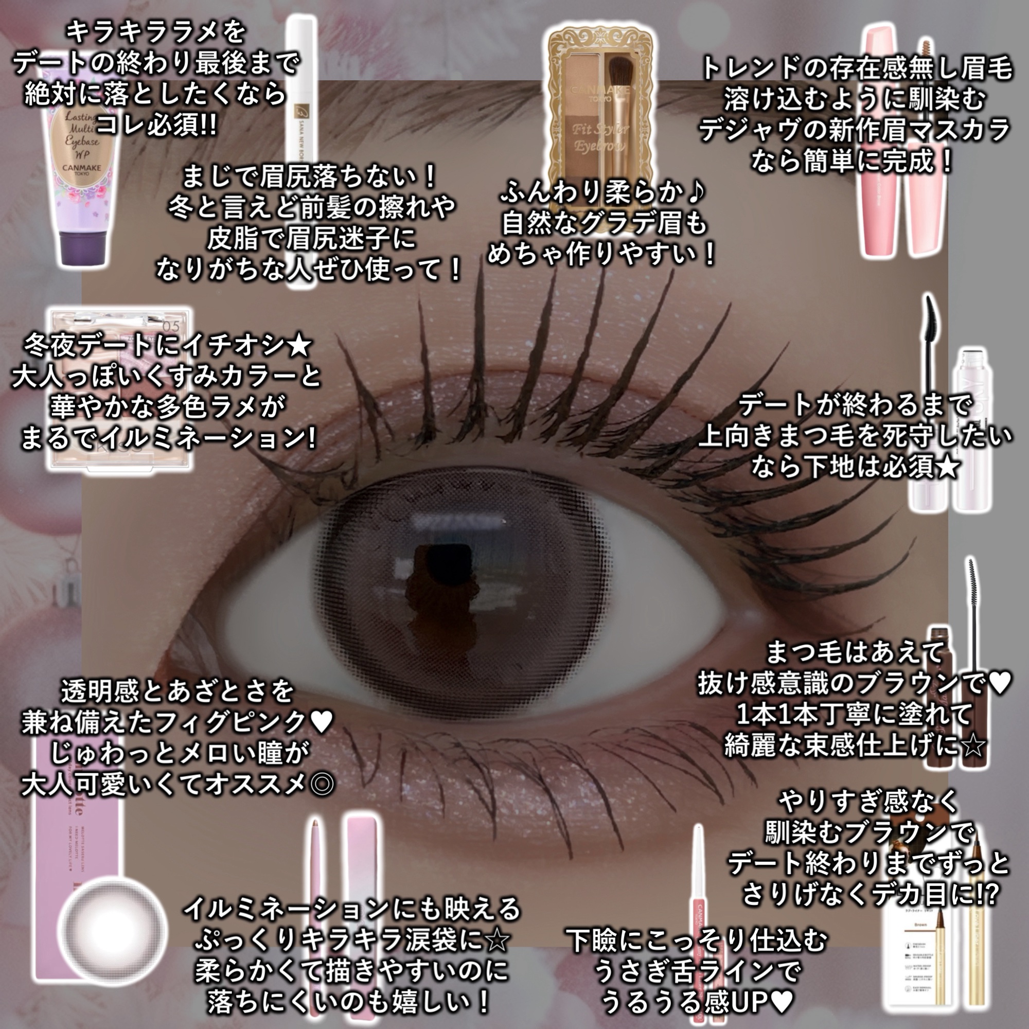 ⏩効果・目の横幅が強調されるデカ目効果メイク・顔の横幅の余白を減らし小顔効果・キリッとクールで大人っぽい印象の目元に ⏩アイシャドウポイント・上まぶたは目頭をめっちゃ濃くして目力UPと目尻の跳ね上げ・下まぶたは目尻太めの涙袋 ⏩アイラインポイント・切開ラインは長く下向きに・目頭側は上下ともにインライン・目尻は大胆に跳ね上げ&やや囲みくの字・涙袋の影は平行四辺型を意識して黒目の終わりを太く、そこから鋭角に上げる ⏩マスカラポイント・とにかく目尻側上下を長く・目頭はビューラーなし、マスカラ控えめ・ブラックだとなお良い ⏩その他・カラコンは裸眼とほぼ同じサイズの小さめ色は明るめが良いと思う