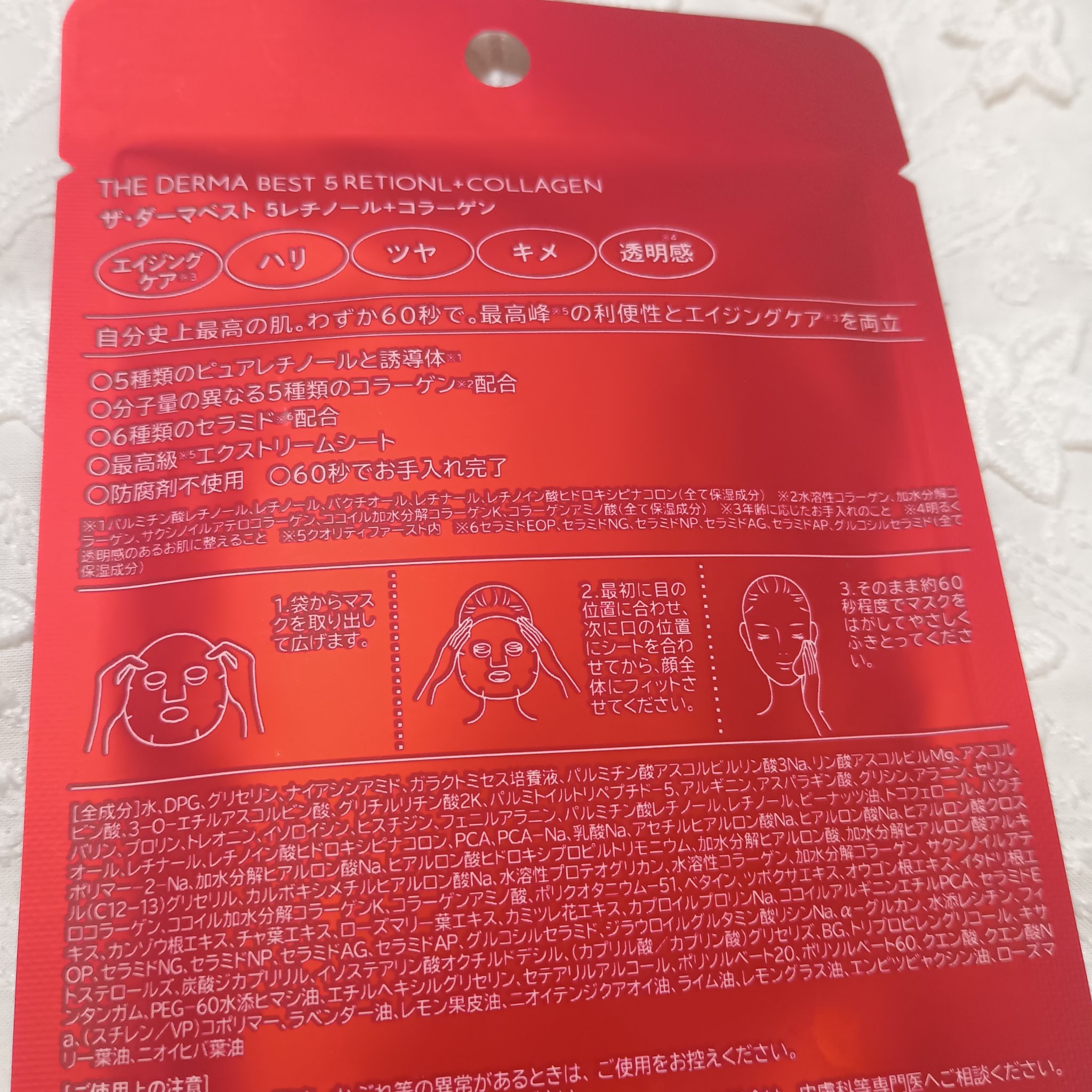 - わずか60秒で【 夜用 】エイジング*1ケアマスク 最高峰*2のエイジングケア*1をサポートする成分として注目の高い5種類のピュアレチノールと誘導体*3を配合。さらに、分子量の異なるコラーゲン*4を贅沢に配合した、夜用エイジングケア*1マスク。シリーズ史上最高級*2の3層構造&厚切り「エクストリームシート」でエイジングケア*1に必要な美容成分をお肌のすみずみまで素早く行きわたらせます。 肌に乗せるだけの簡単ケアで、気になる年齢サインに多角的にアプローチし、ハリ感、キメ、潤い、ツヤのある肌へ。この1枚、60秒でお手入れ完了できるパフォーマンスを徹底的に追求しました。 *1年齢に応じたお手入れのこと *2クオリティファーストとして *3パルミチン酸レチノール、レチノール、バクチオール、レチナール、レチノイン酸ヒドロキシピナコロン(全て保湿成分) *4水溶性コラーゲン、加水分解コラーゲン、サクシノイルアテロコラーゲン、ココイル加水分解コラーゲンK、コラーゲンアミノ酸(全て保湿成分)