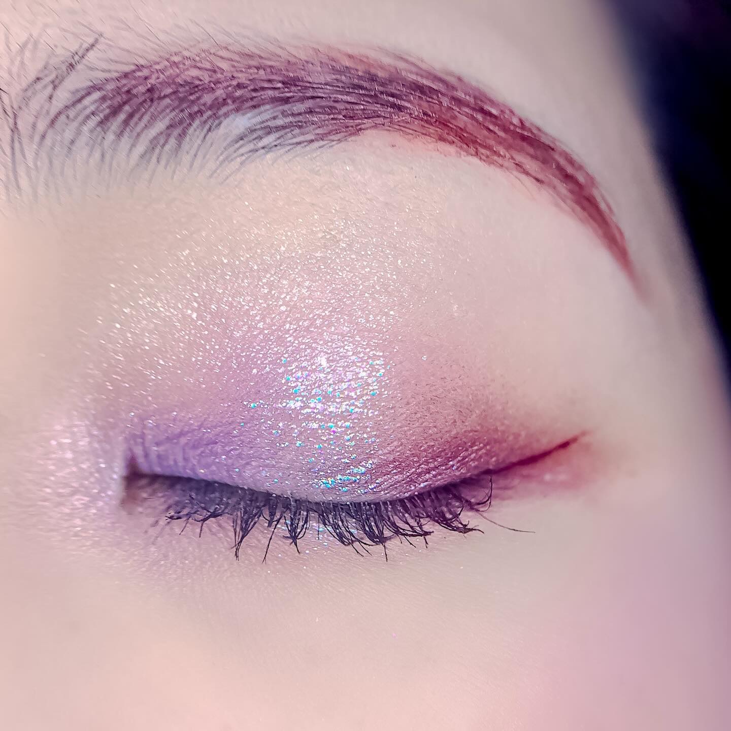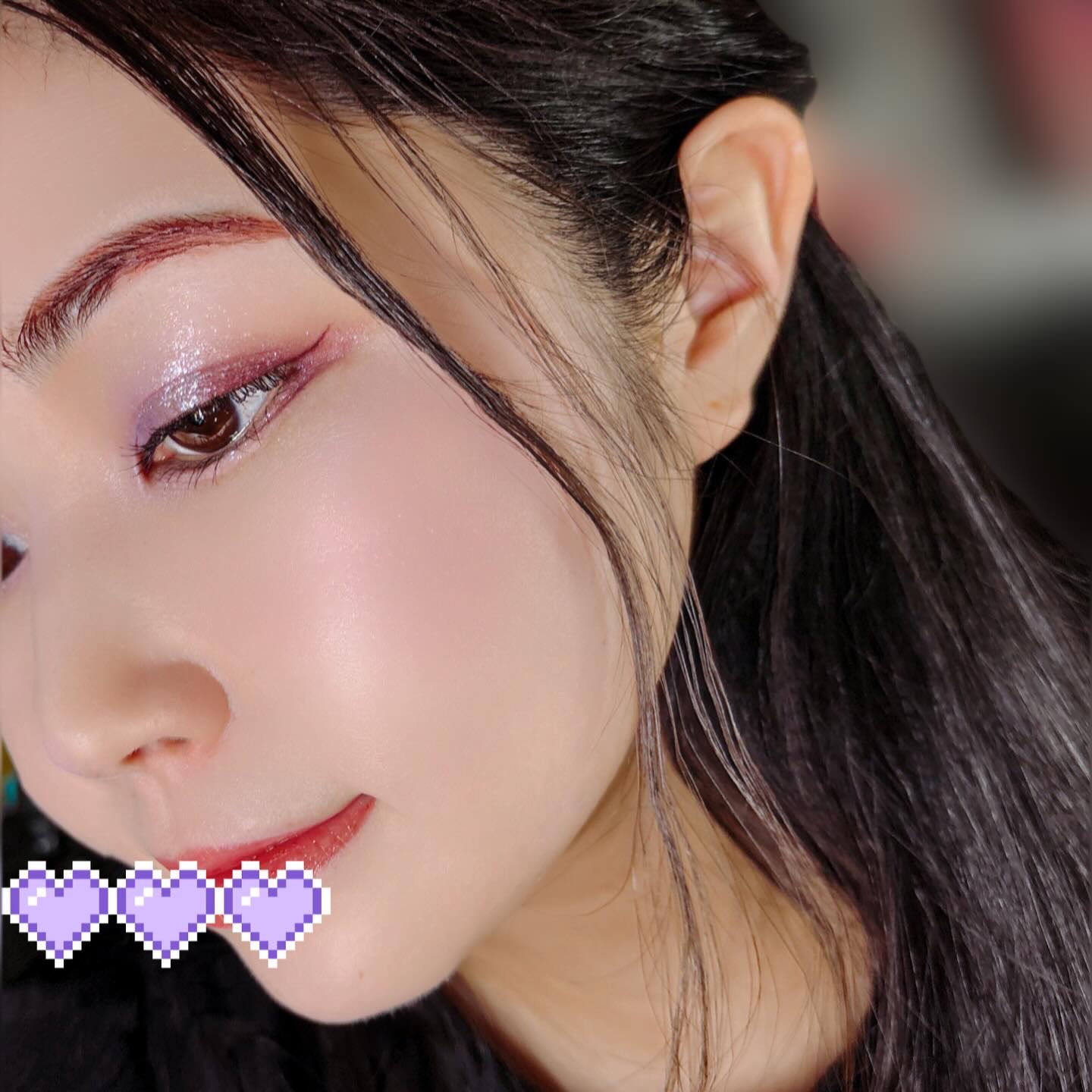 ベースに右上、目頭から黒目上に真ん中、黒目〜目尻に右下を、左上を目頭にくの字に塗ってもらいました✨ ピンクサクラよりもクールな感じで、目で見た色より私の肌では紫っぽく発色しました😍 上2つはラメはぎっしりでときめく💓 ブラウンメイクがとても苦手だけれどこれならブラウンメイク出来そう👌(かなり紫寄りですが) くすみ感は強いので苦手な方は厳しいかも…(特に真ん中) クールな印象になるので大人顔さん向けor大人顔になりたい方向けのイメージです✨