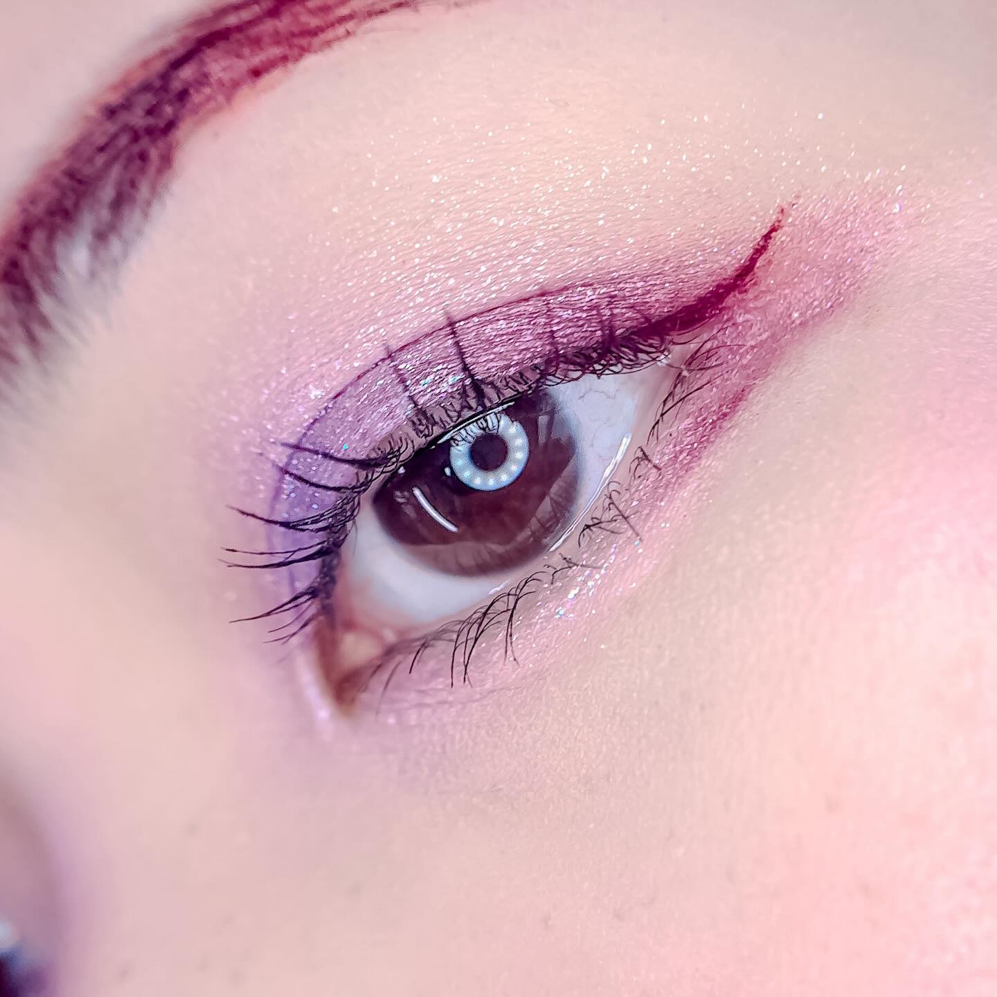 ピンクにグレージュも良いですね👌💗 今日は可愛らしい感じにしてみました💕 上下瞼黒目〜目頭側にラメを塗ってキラキラさせております🤩 目尻はマットのピンクを濃いめに重ねて💗 グレージュのアイライナーと相性◎