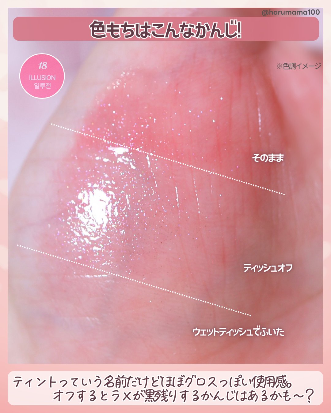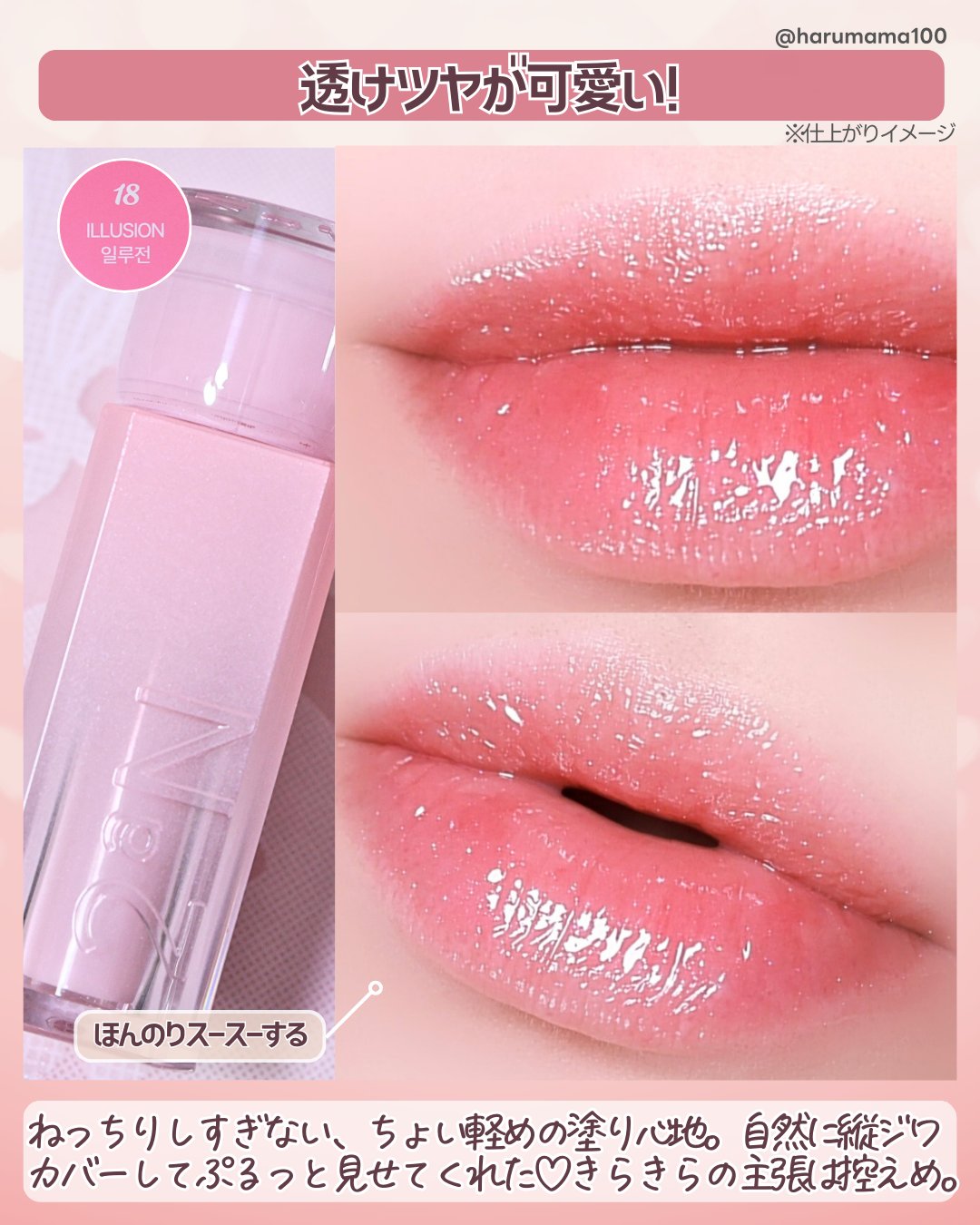 - ほんのりプランピング効果で痛くないぷっくりティント。 もっちりなのに嫌なべたつきがなく使いやすい。 縦ジワがなくなる綺麗な唇を~! ひと塗りで輝く、 澄んだ透明感あふれるぷるんとしたキャンディツヤ🍭 ティントにグロスの長所をプラスしたテクスチャーで、 ベタつかず長時間続く光沢を ✧˖*°࿐