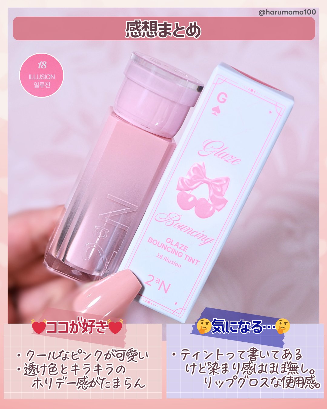 10色スウォッチしてみた°ʚ🎀ɞ°.❤︎︎︎︎❤︎2aNグレイズバウンシングティント❤︎︎︎︎❤︎プランプ効果もあるからぷるちゅるでシワも目立たないから使いやすい◎どのカラーも可愛くて好き。もう少しティント力があったら嬉しい(´⊃•ω•⊂`)...