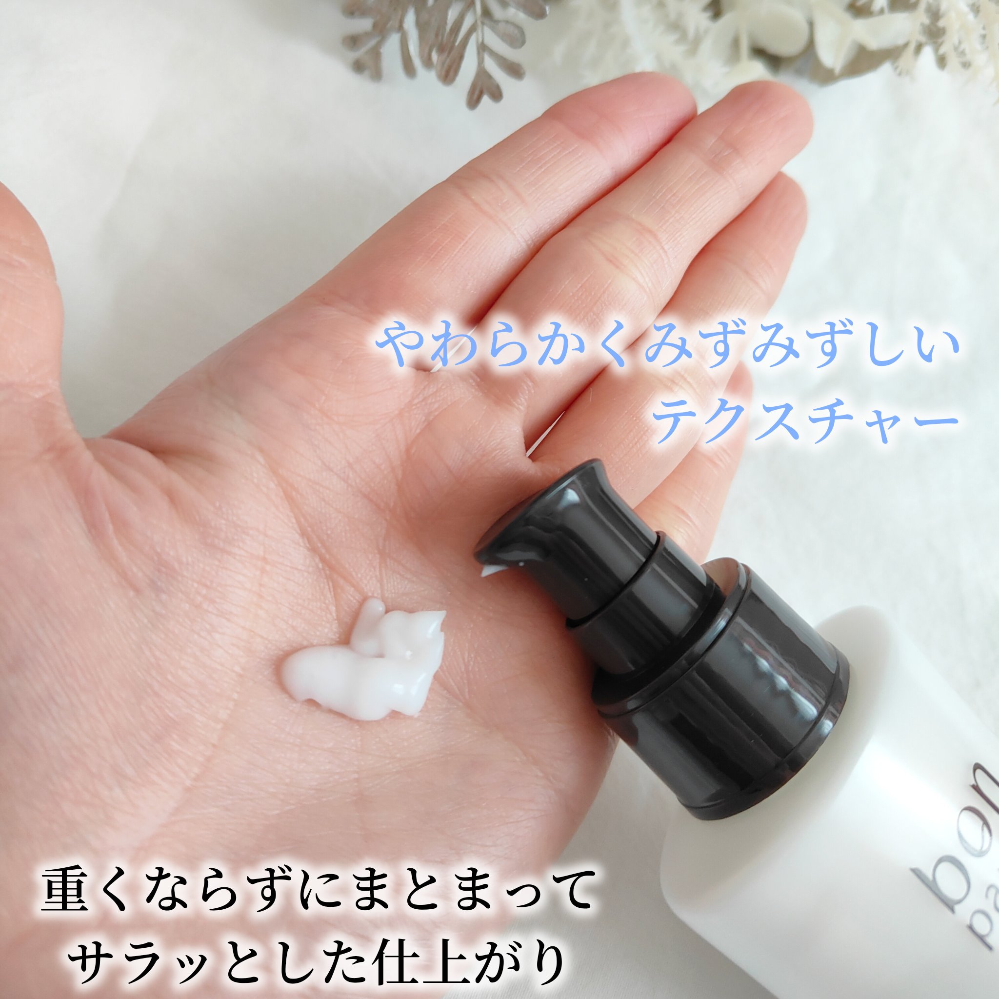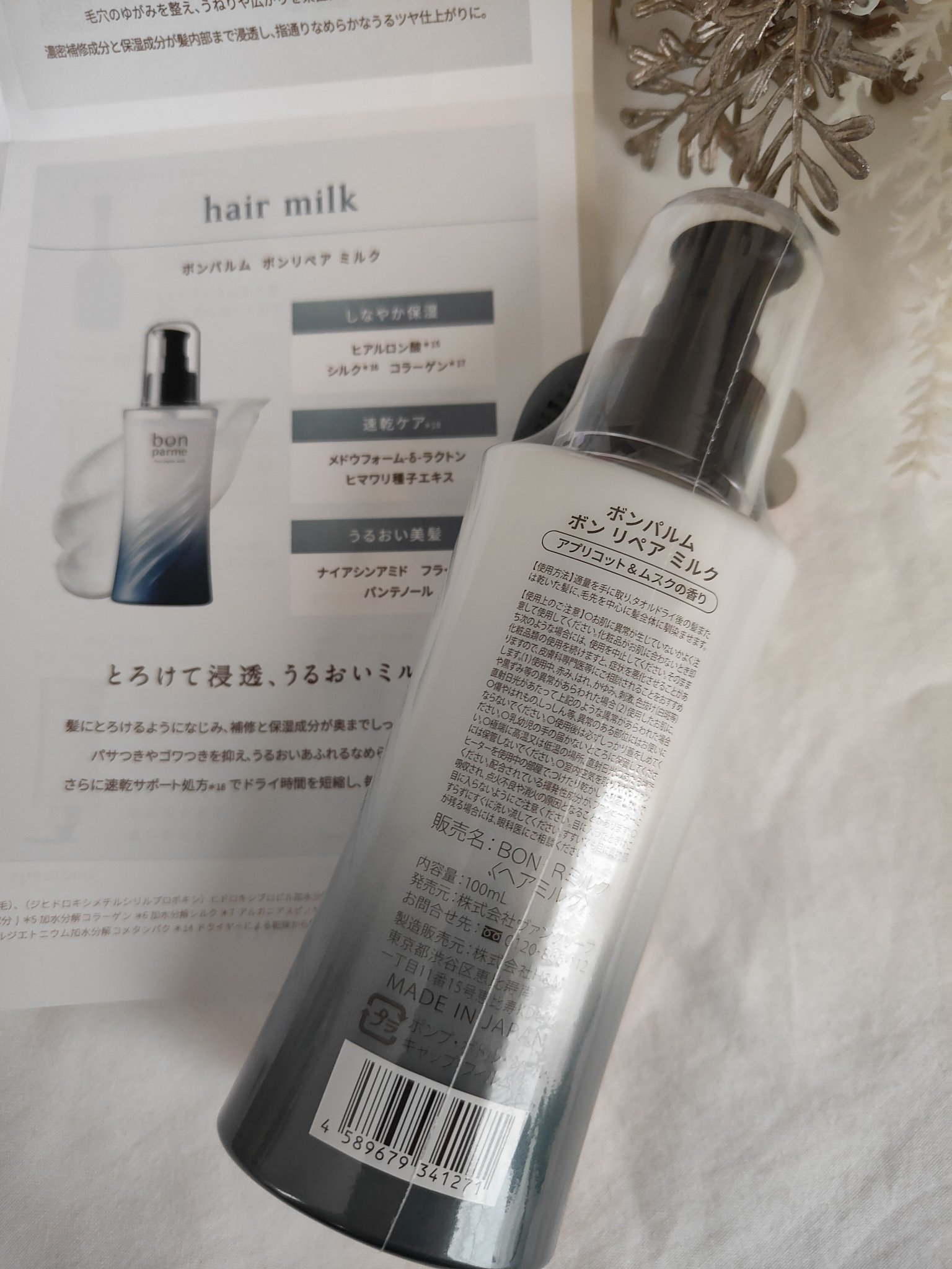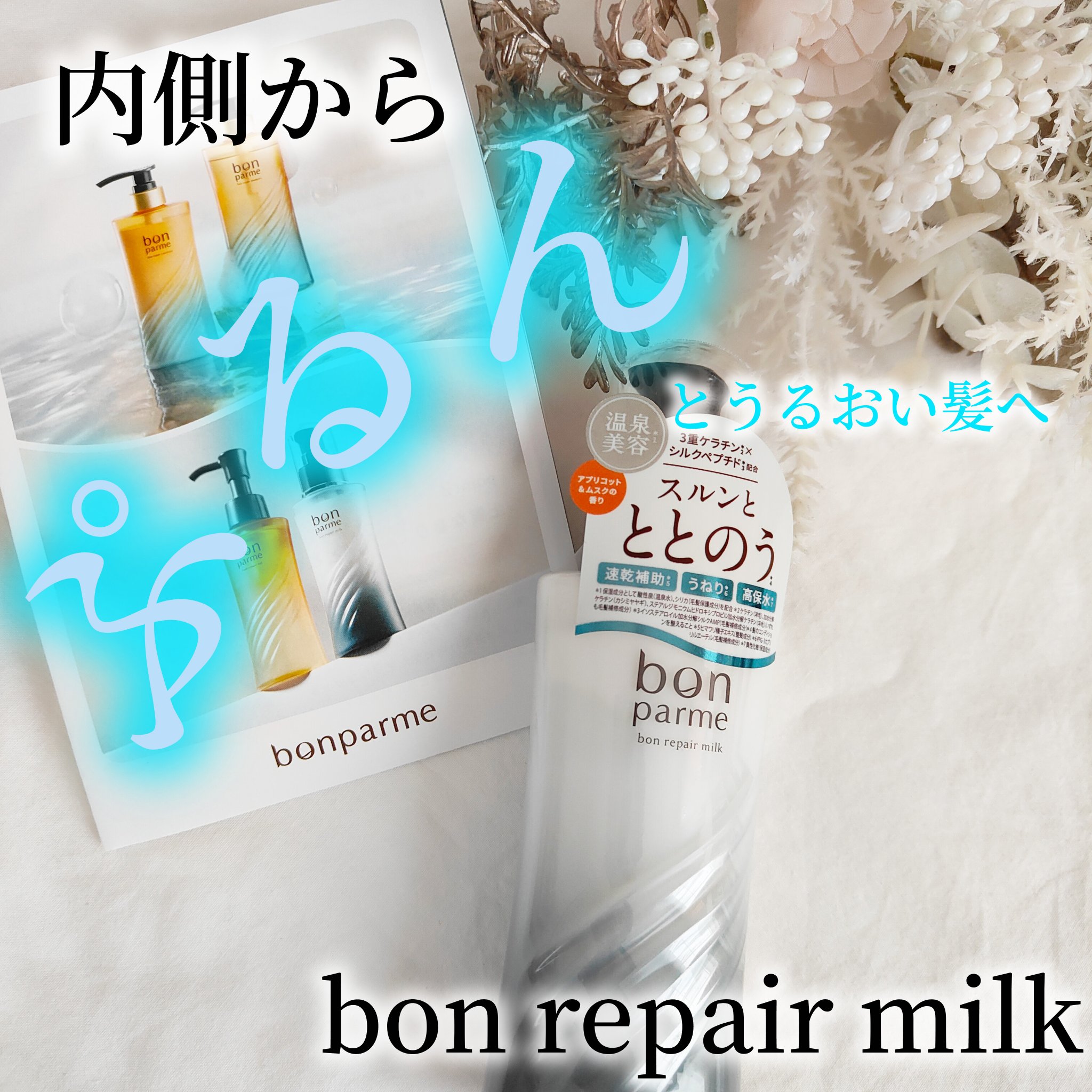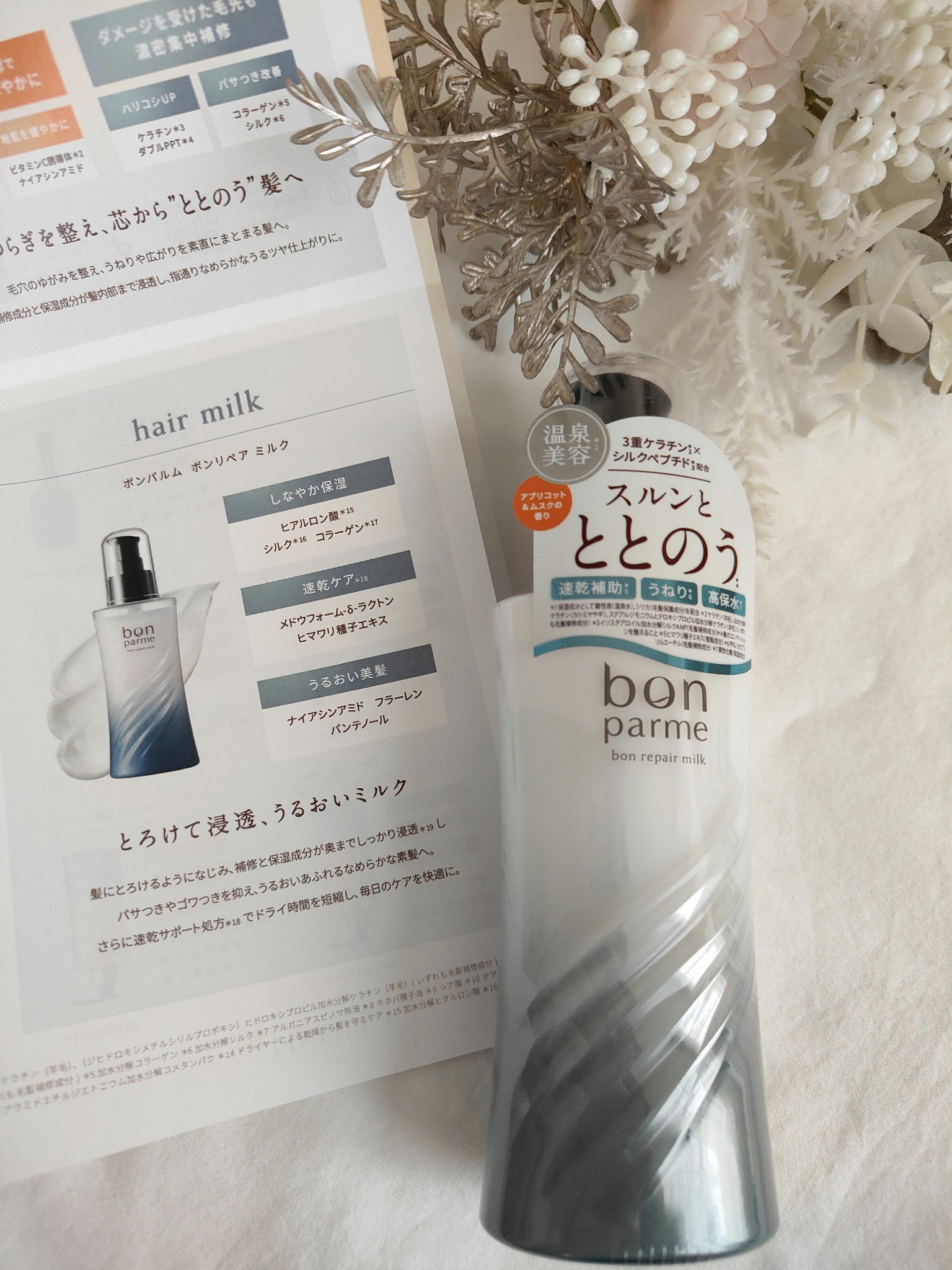 - 髪内部を濃密補修し、水分をぎゅっとチャージ。 ぷるんとうるおい、しなやかに続く“ヘアミルク” 【アプリコット&ムスクの香り】 ボンリペアミルクは、髪内部に「濃密補修」を届け、水分をギュッとチャージする洗い流さないトリートメントミルクです。 うるおいを内に秘めたしなやかな質感が続き、自然でまとまりのある“素髪感”へ導きます。 3種のペプチドと3重ケラチンによる高浸透補修がダメージホールをピンポイントで補修し、失われた密度感を取り戻して弾力のある髪に。 ヒアルロン酸、ペンタパイティン、温泉水による多層的保湿・保水成分が内部からのうるおいを閉じ込め、ぷるんとなめらかな髪へ導きます。 ◆セレクト温泉水『シリカ酸性泉』 髪の主成分「ケラチン」を支えるミネラル『シリカ』と、 キューティクルをきゅっと引き締め水分を閉じ込める「酸性泉」を組み合わせた温泉水。 乾燥や摩擦、紫外線などの外的ダメージから髪を守ります。 ◆髪を満たす『濃密補修&保水成分』 3重ケラチン・3種ペプチド・加水分解コラーゲンに加え、 ヒアルロン酸やペンタバイティンを配合。 髪内部にうるおいをたっぷりチャージし、毛先までしなやかで弾むような質感へ。 ◆スキンケア発想の『美容成分』 「ナイアシンアミド」「CICA」「ビタミンC誘導体」など、 美容分野でも注目される成分を配合。 髪と頭皮を健やかに整え、ハリ・コシを与えながら、 日中のダメージから髪を守ります。 *年齢に応じたケア