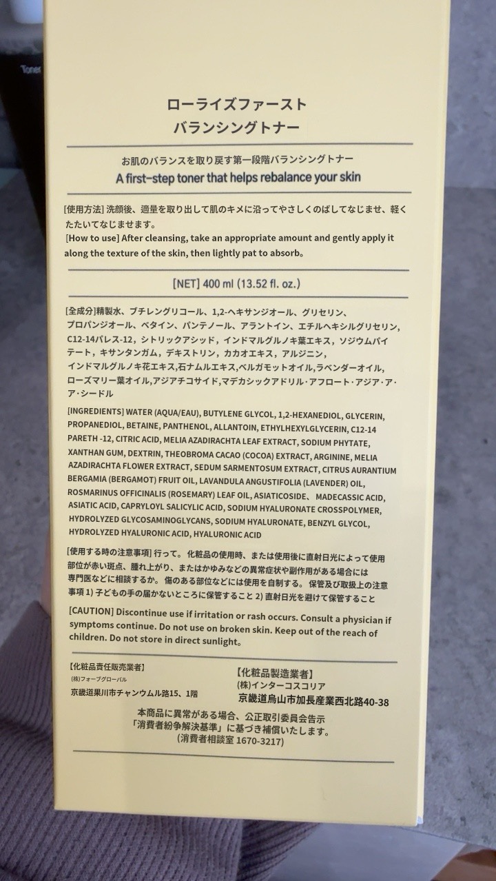 - <400ml> 水、BG、1,2-ヘキサンジオール、グリセリン、プロパンジオール、ベタイン、パンテノール、アラントイン、エチルヘキシルグリセリン、(C12-14)アルケス-12、クエン酸、メリアアザジラクタ葉エキス、フィチン酸Na、キサンタンガム、デキストリン、カカオエキス、アルギニン、メリアアザジラクタ花エキス、ツルマンネングサエキス、ベルガモット果実油、ラベンダー油、ローズマリー葉油、アシアチコシド、マデカシン酸、アシアチン酸、カプリロイルサリチル酸、ヒアルロン酸クロスポリマーNa、加水分解ムコ多糖、ヒアルロン酸Na、ベンジルグリコール、加水分解ヒアルロン酸、ヒアルロン酸